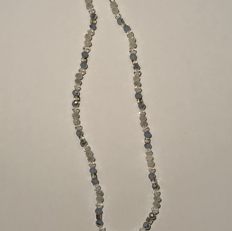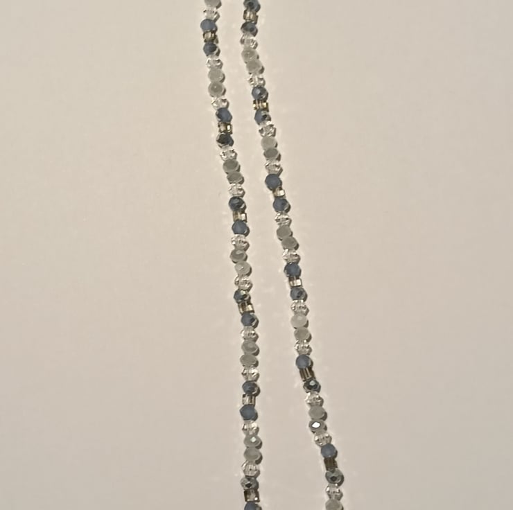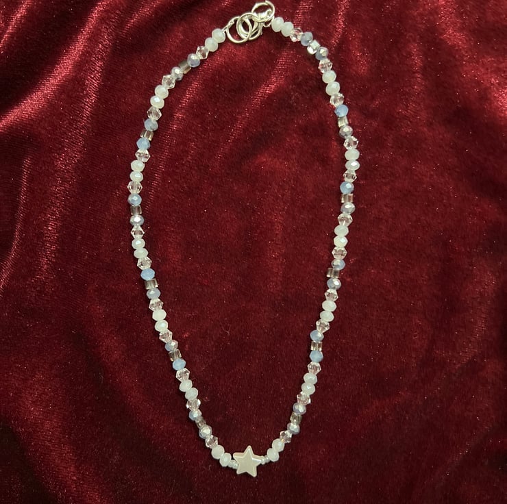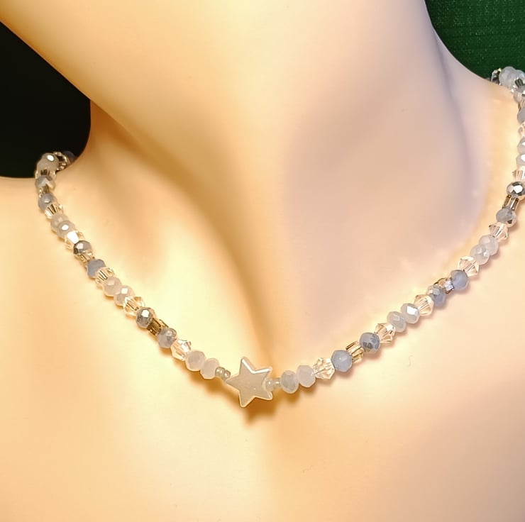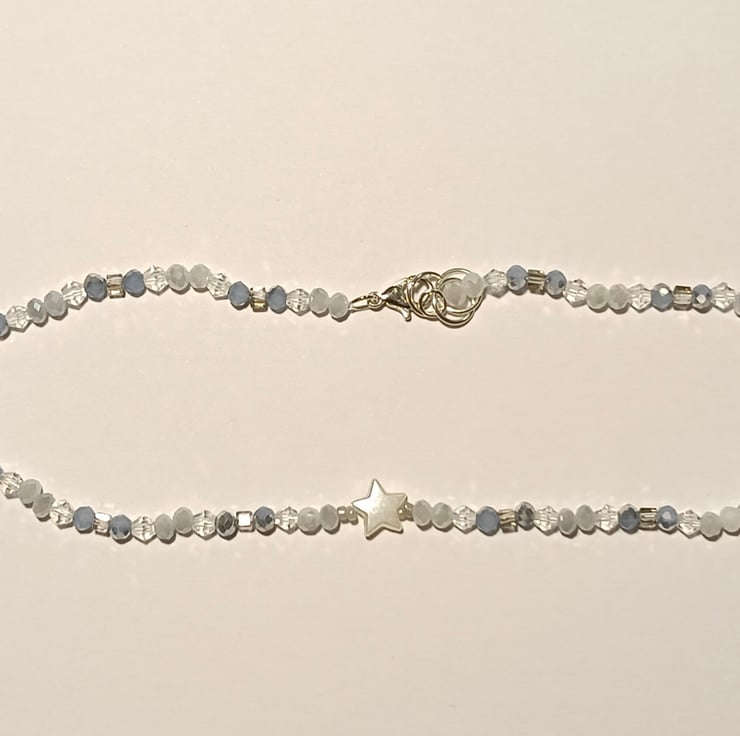 This unique piece consists of one 15mm silver star as the centre piece . Next to the star is 1mm grey glass beads , 4mm light grey crystal beads, 4mm clear transparent bicon beads , 4mm two-toned silver and blue crystal beads and 3mm translucent grey square crystal beads .