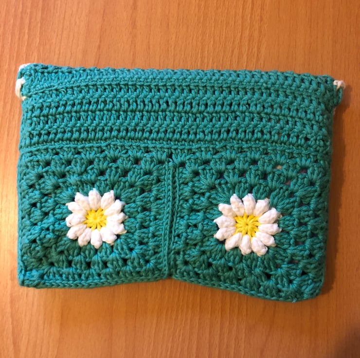 Each sleeve is crocheted by hand using leftover cotton yarns from my basket of scraps — because I believe even the smallest pieces of yarn can become something beautiful and useful. Every combination of colors and flowers is unique, making each sleeve truly one of a kind.