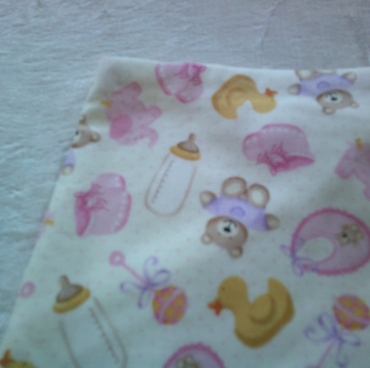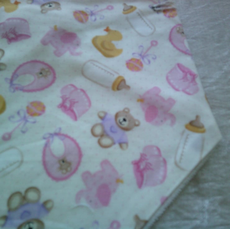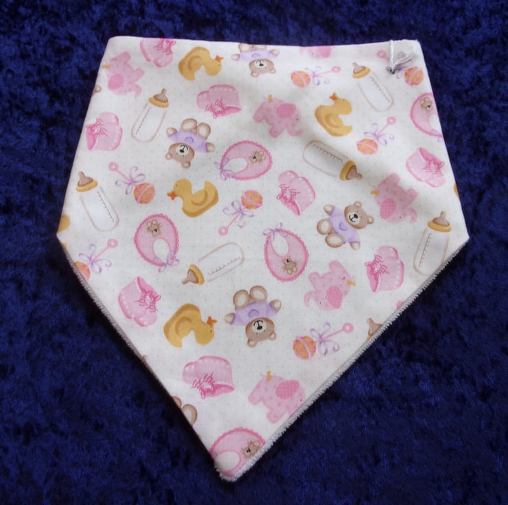 The fabric used for this dribble bib is of babies bottles, bibs, bootees in pink, teddy bears and ducks on a cream background.