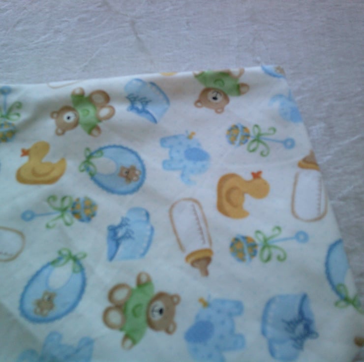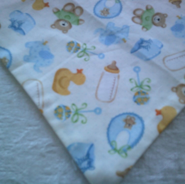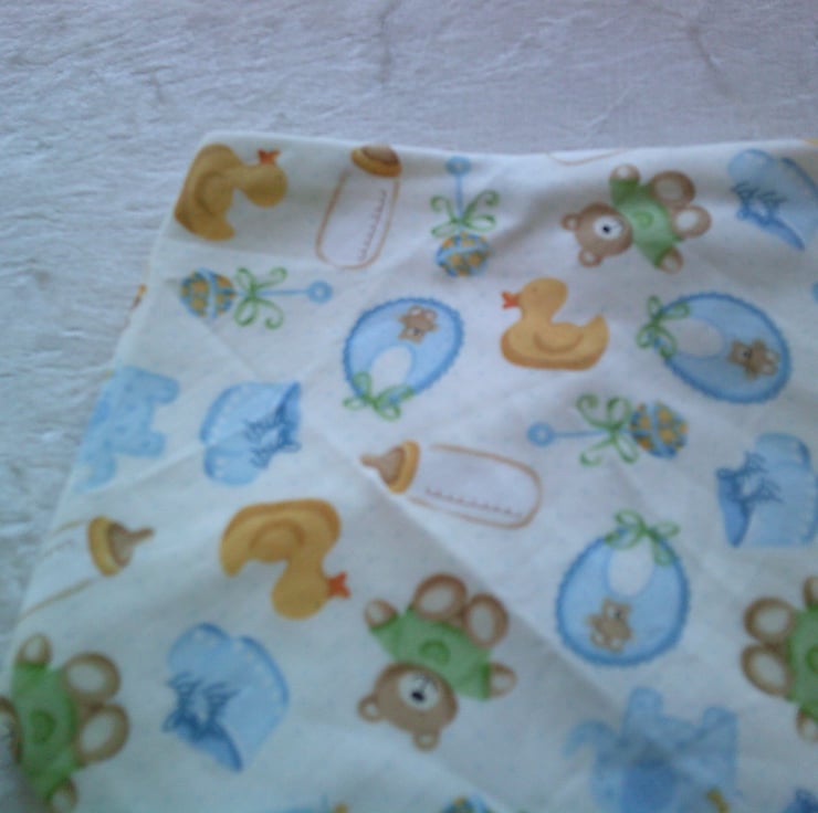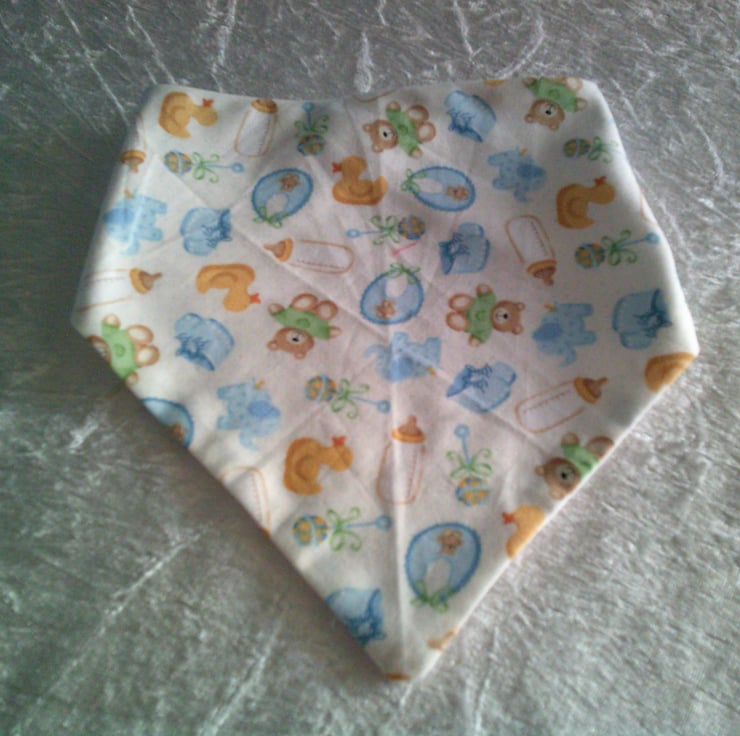 The fabric used for this dribble bib is of babies bottles, bibs, bootees in blue, teddy bears and ducks on a cream background.