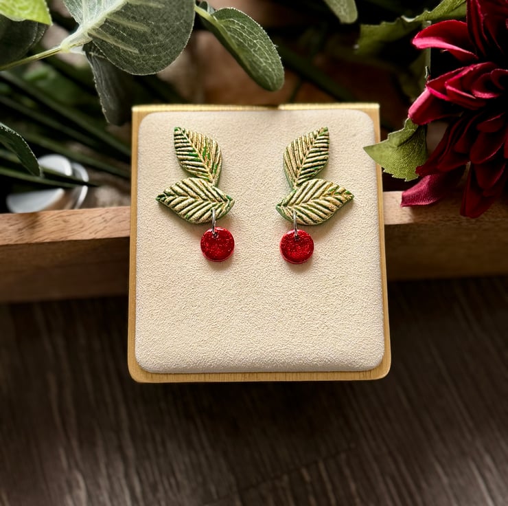 Made from polymer clay, each pair features embossed leaf details in Christmas green and accented with gold leaf foil and shimmering red foil berries.