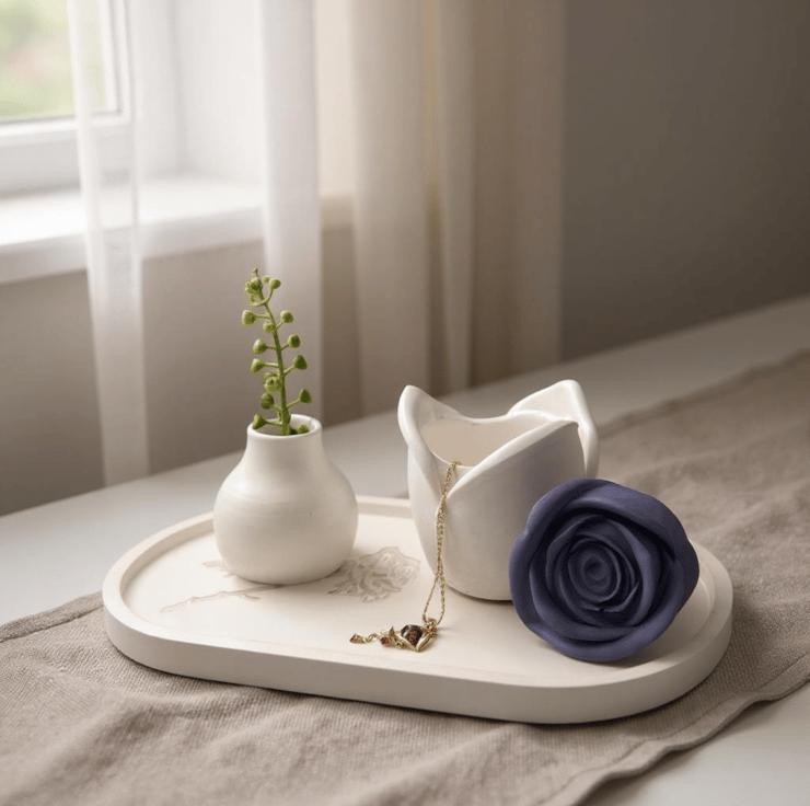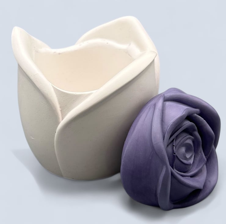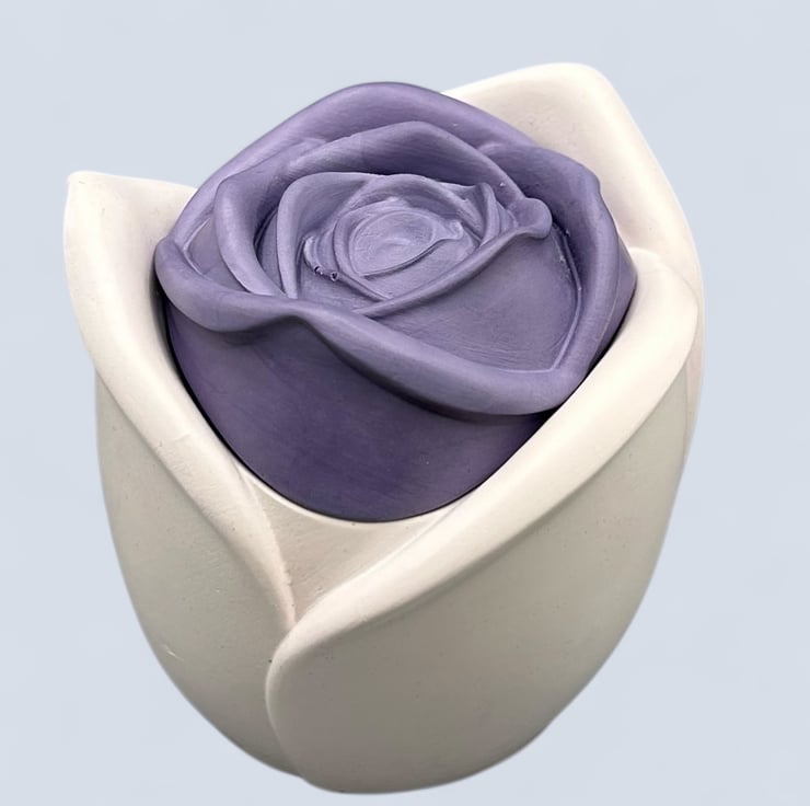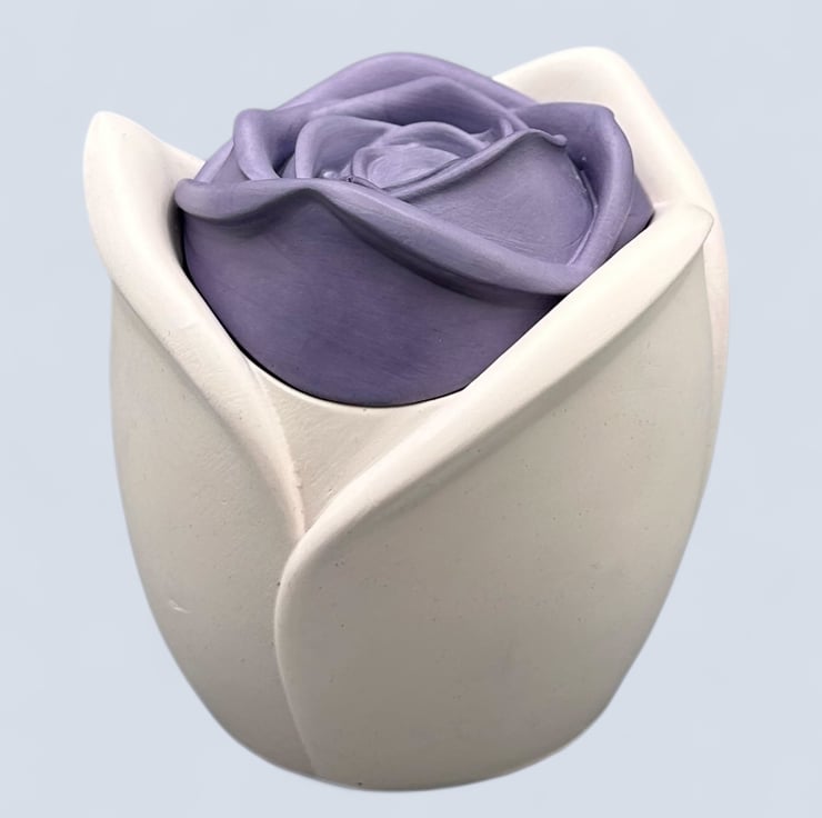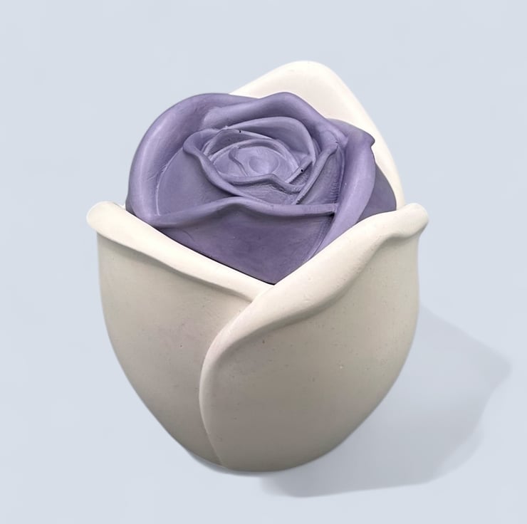 My charming trinket pot is exquisitely shaped like a rose. At the base, three elegant sepals form the pot, which is topped with a stunning blackcurrant rose lid. The deep purple-black tone adds a rich, sophisticated contrast to the soft white base, creating a beautiful decorative piece that catches the eye.