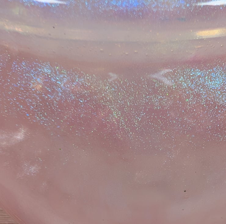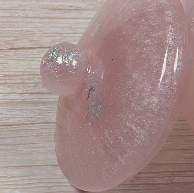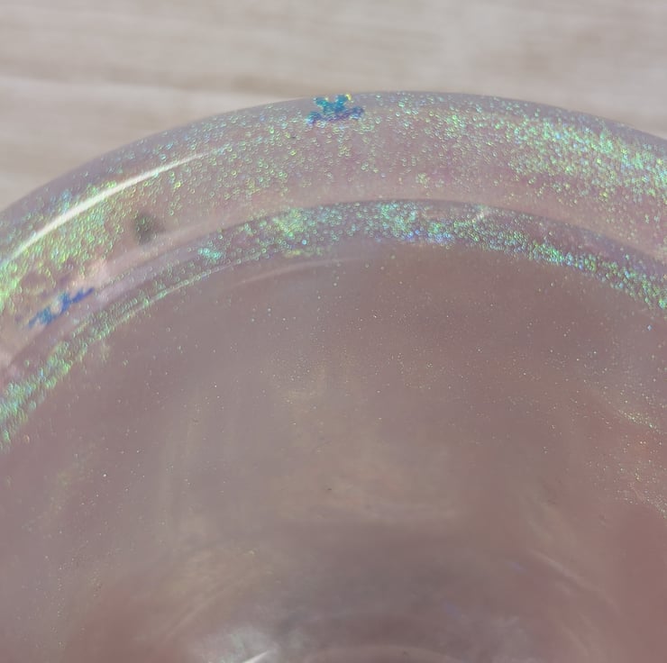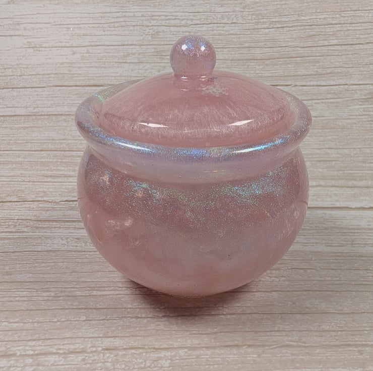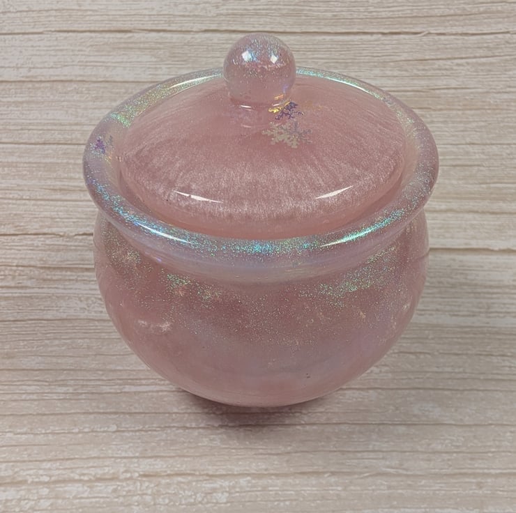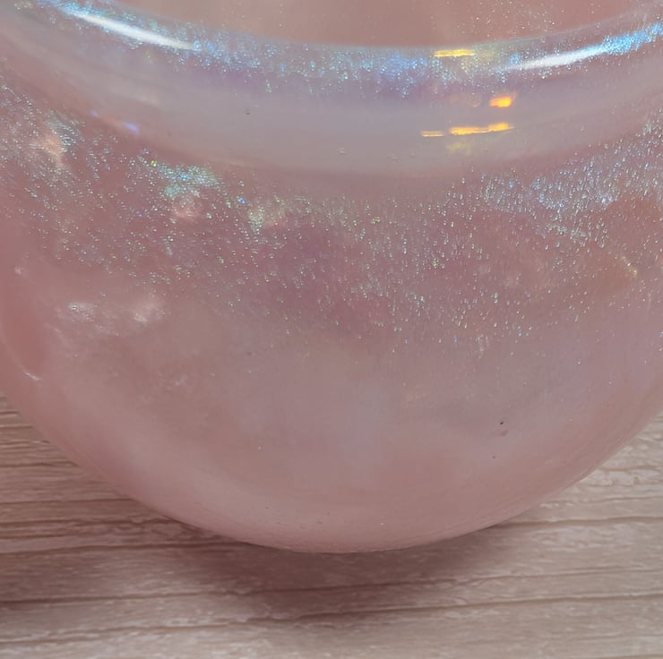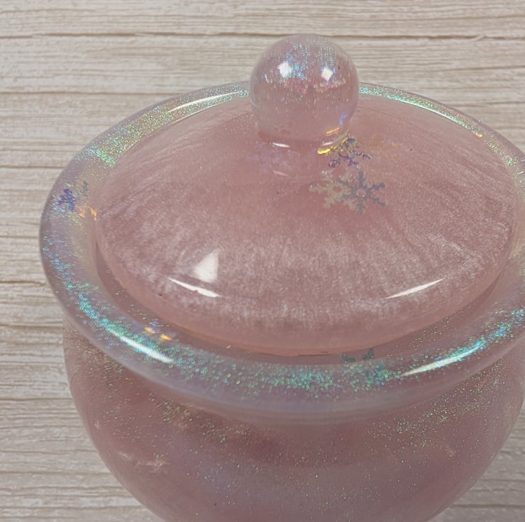 This soft pink jar shimmers with an ethereal glow which shifts in the light like rose quartz catching the morning sun. The surface has a gentle pearlescent sheen, finished with iridescent snowflake accents that change colour depending on the angle. Each jar is poured by hand.