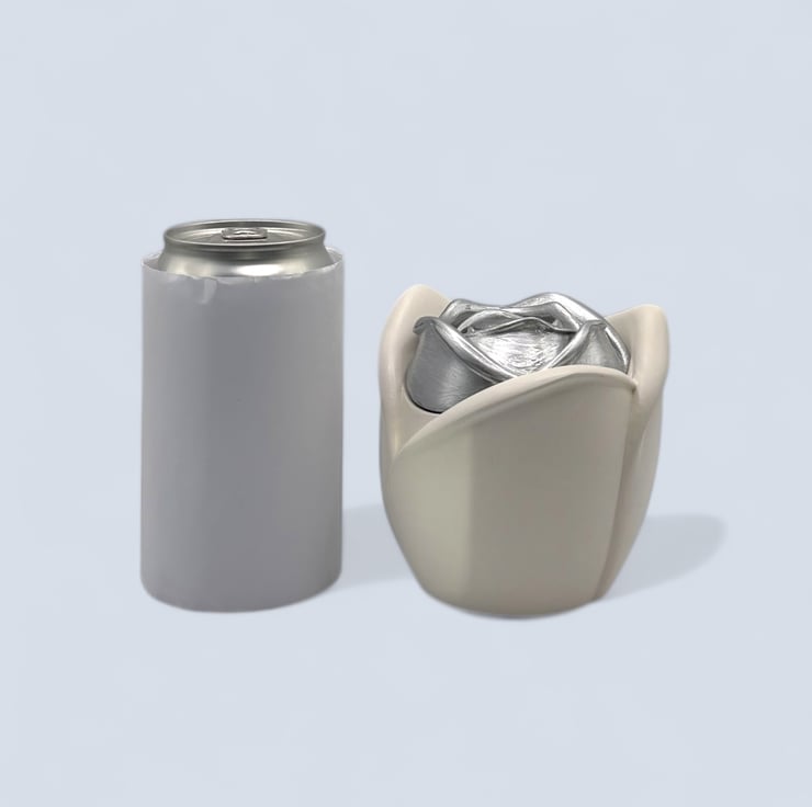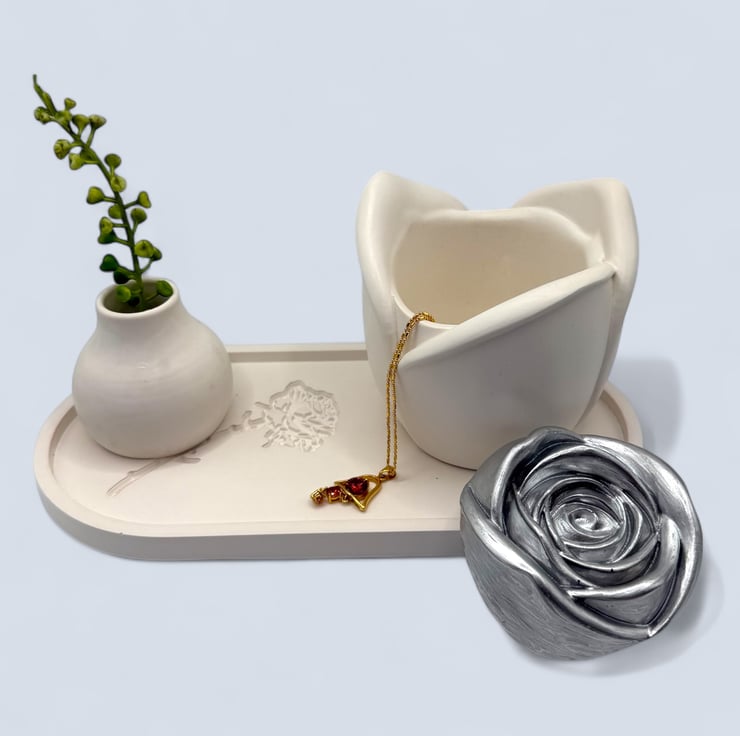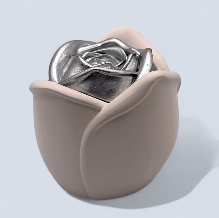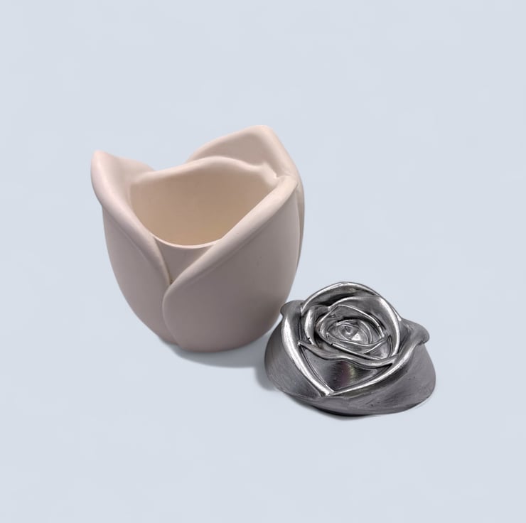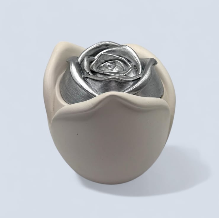This elegant white trinket pot is beautifully shaped like a rose, with three softly curved sepals forming the base and a metallic silver lid that has been carefully hand painted with acrylic paint. The silver finish gives the piece a luxurious, contemporary look, creating a striking contrast against the smooth white base.
