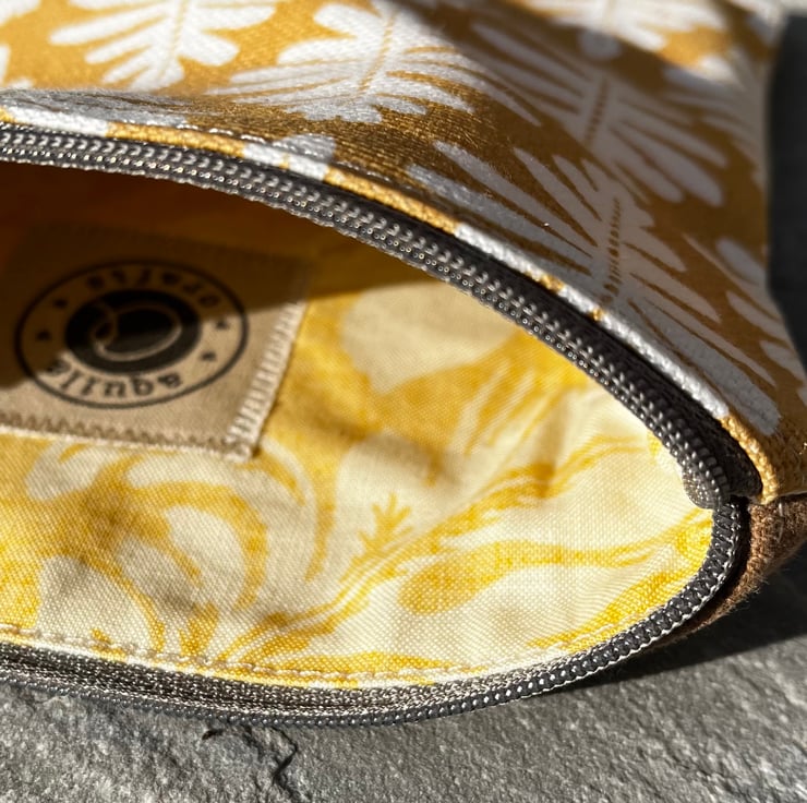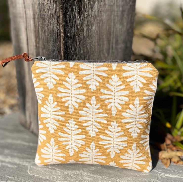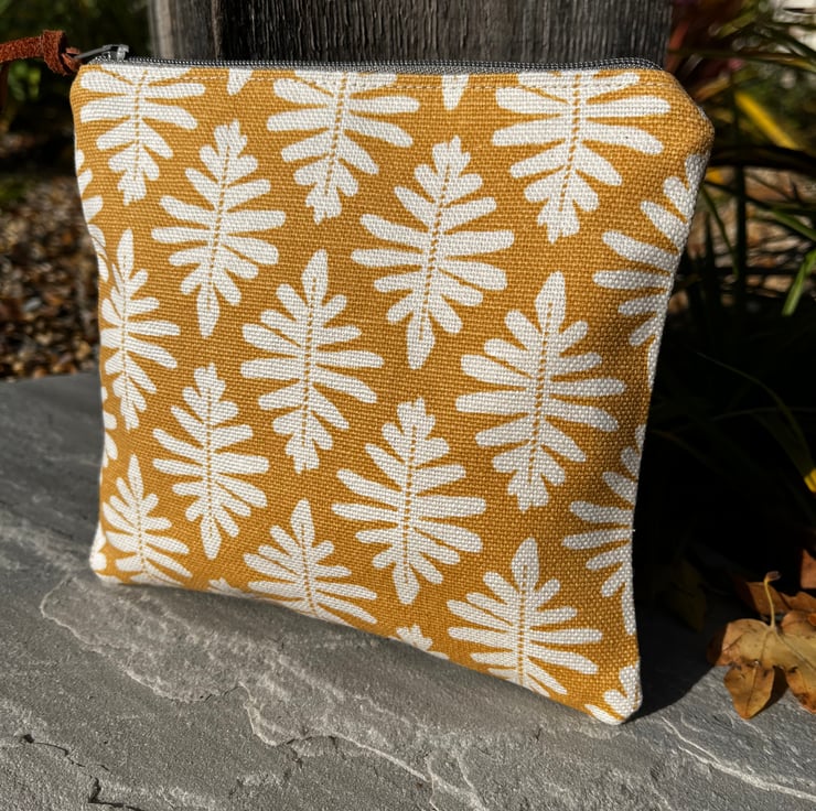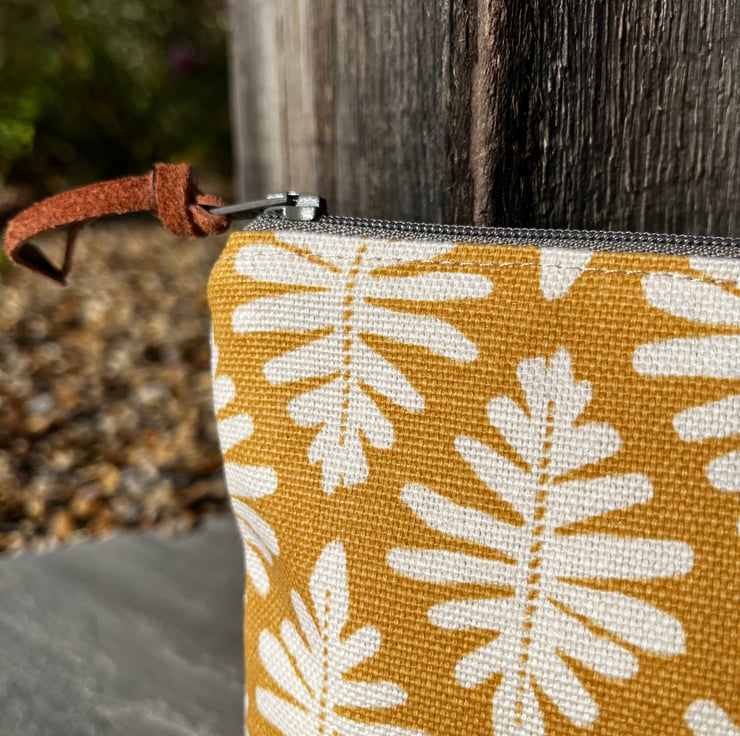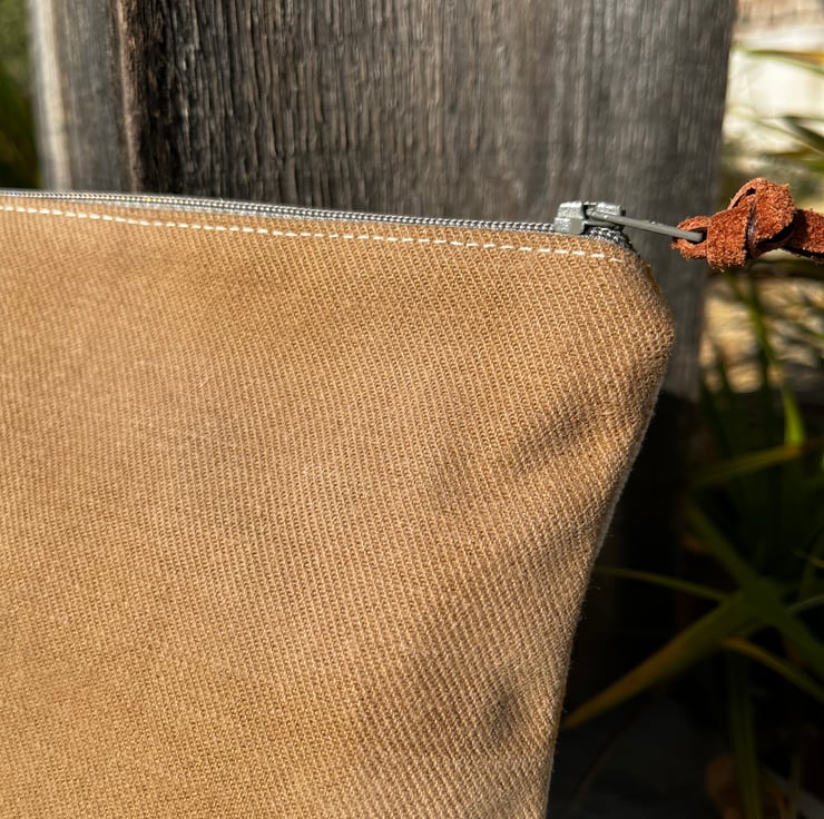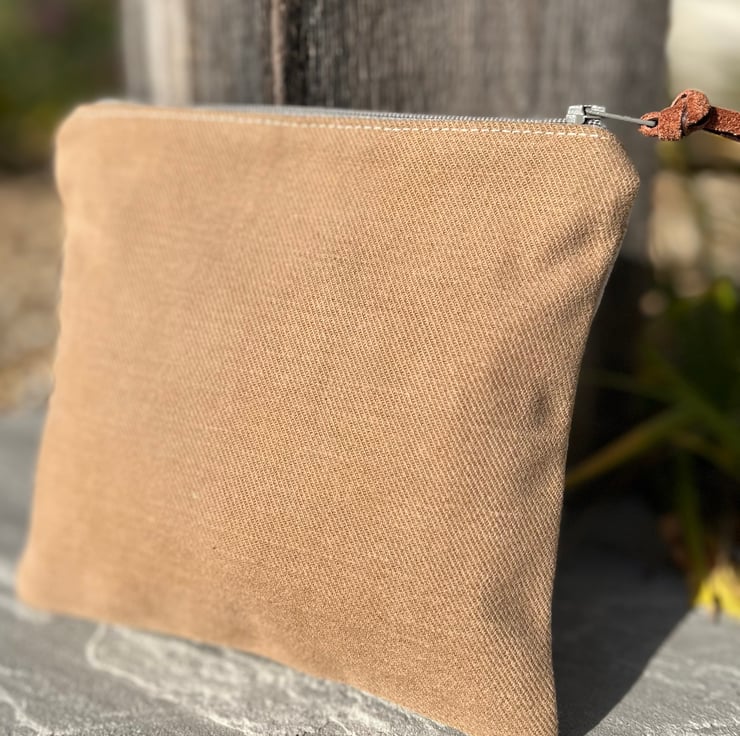 A strip of leather is tied to the zip pull. The leather was waste from a local upholsterer. This can be swapped for ribbon if preferred, just add a note at checkout.