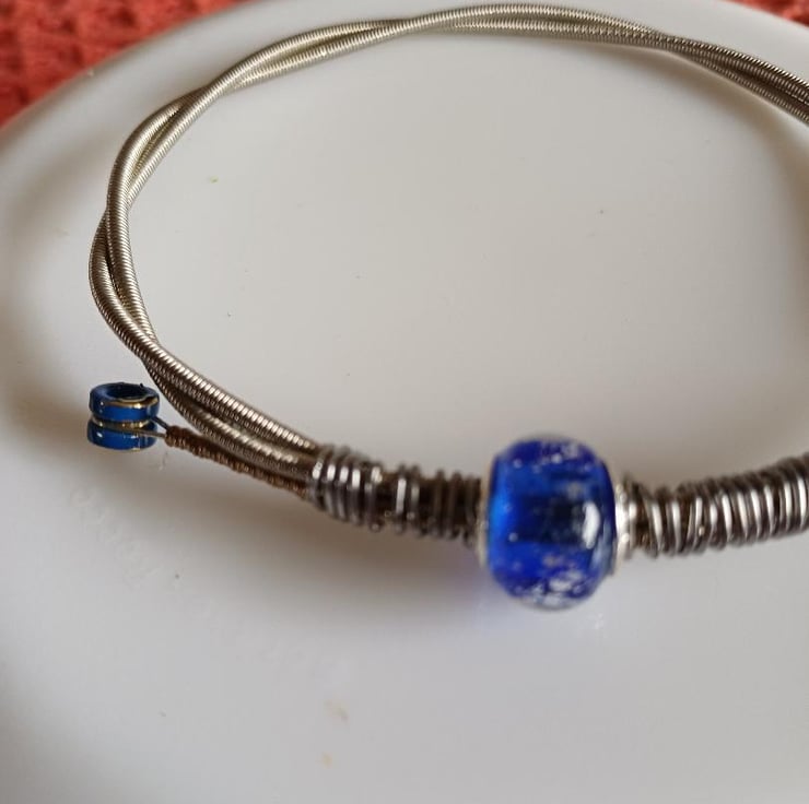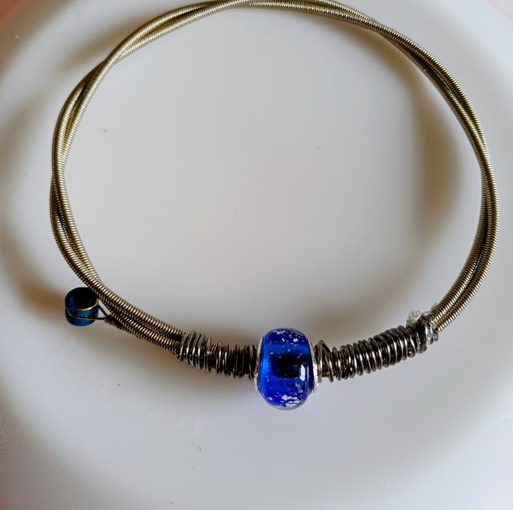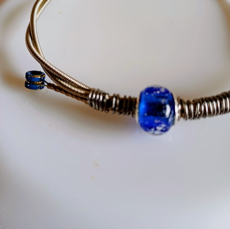 This is a funky bangle made from my sons used guitar string. (It has been sterilised and cleaned). Wrapped with silver wire and finished with a blue bead to match the blue peg on the string. A cool gift for any guitarist ! It will fit any wrist size, but probably more suitable for a man's wrist as it's on the large side.