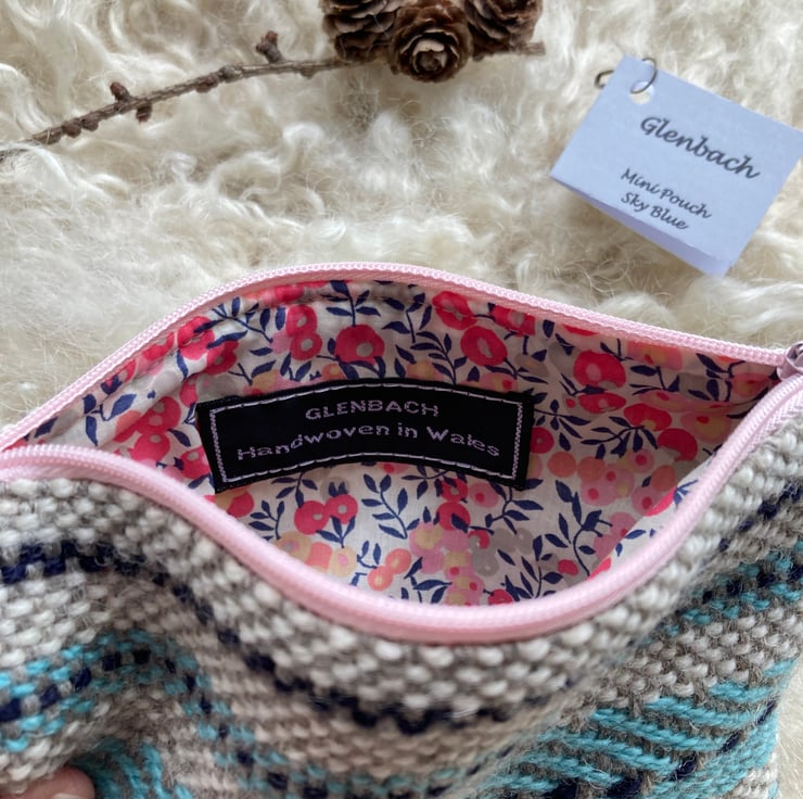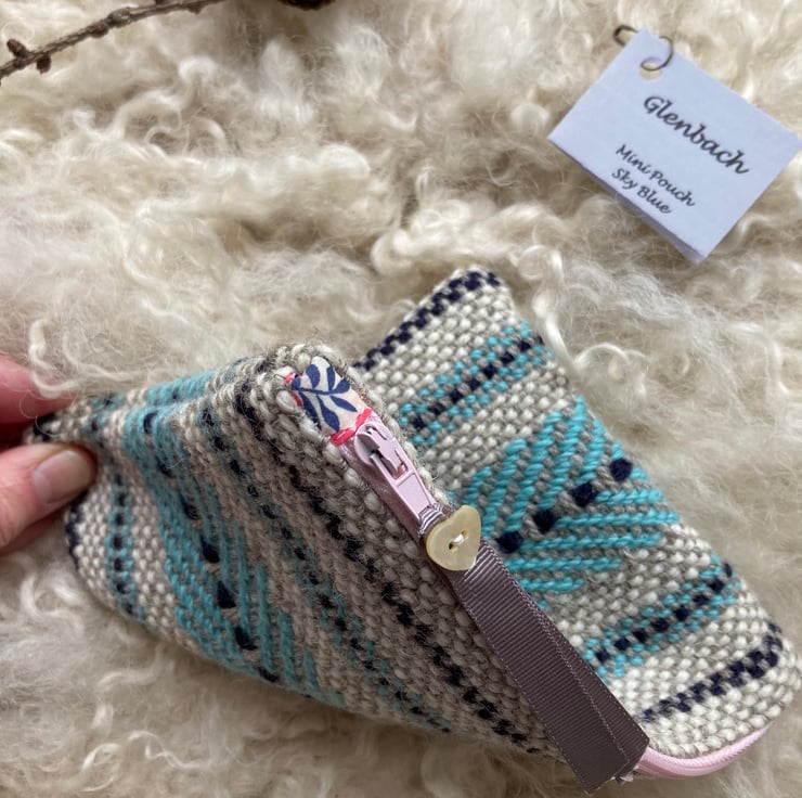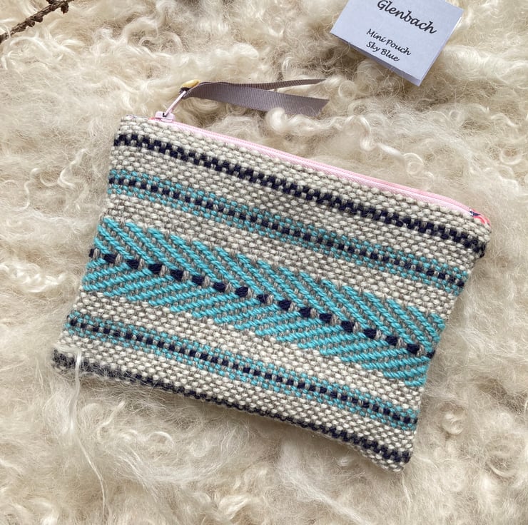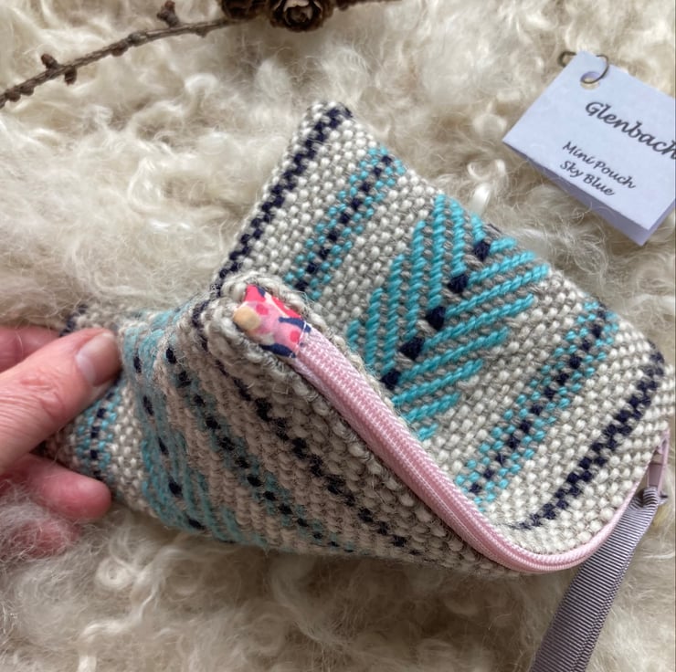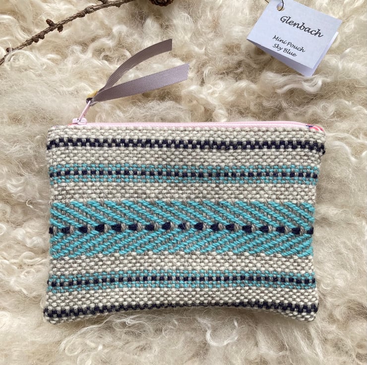 Our Mini pouch is handwoven using natural shades of grey and ecru wool with a contrast of sky blue and navy - all British wool.