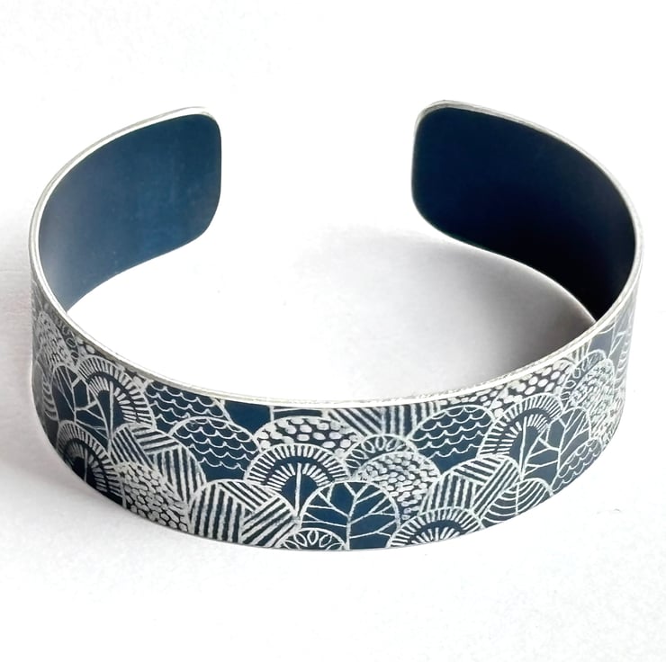 A stylish bracelet/narrow cuff made from anodised aluminium with a print of stylised trees. I drew this pattern digitally, made it into a resist and applied it to the metal. I then dye the aluminium, seal it and remove the resist which leaves the pattern showing in the original colour of the metal. The cuff is then made using traditional metalworking techniques.