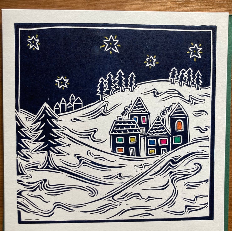5 cards - one of each design: polar bear, robin, carol singers, winter village and Scandi star