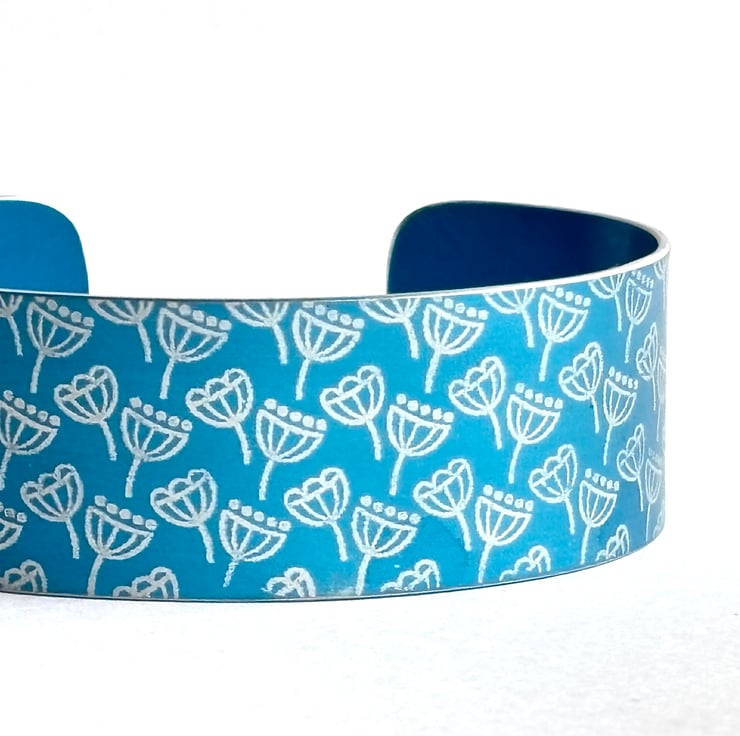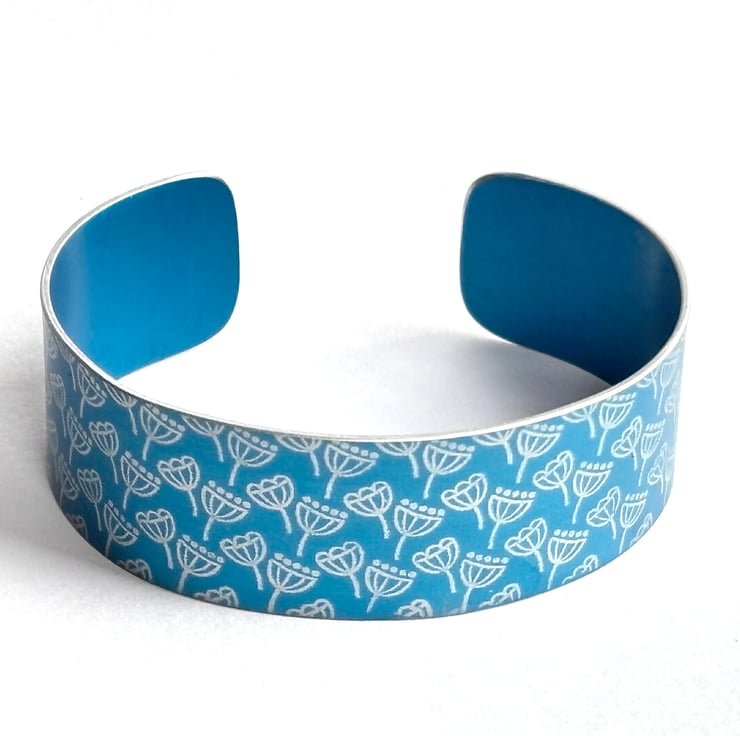 A quirky bracelet/narrow cuff made from anodised aluminium with a mini print of seed heads. I drew this pattern digitally, made it into a resist and applied it to the metal. I then dye the aluminium, seal it and remove the resist which leaves the pattern showing in the original colour of the metal. The cuff is then made using traditional metalworking techniques.