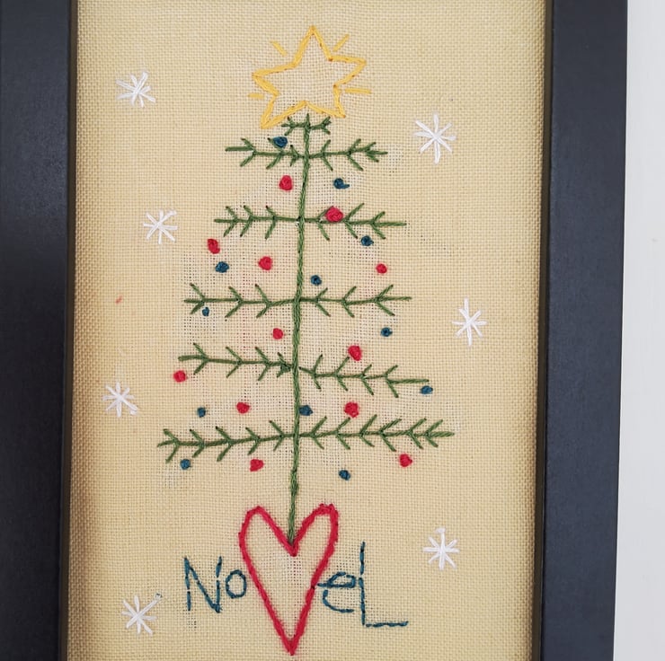 Primitive style Christmas sampler has been embroidered using Anchor threads on Irish linen that is almost 70 years old but 'new' and still has that lovely crisp finish.