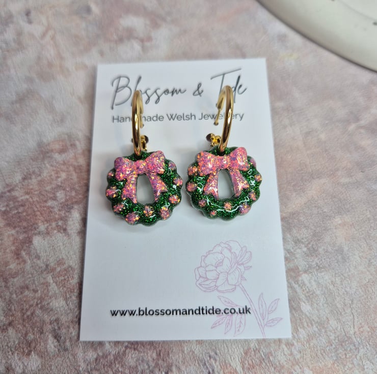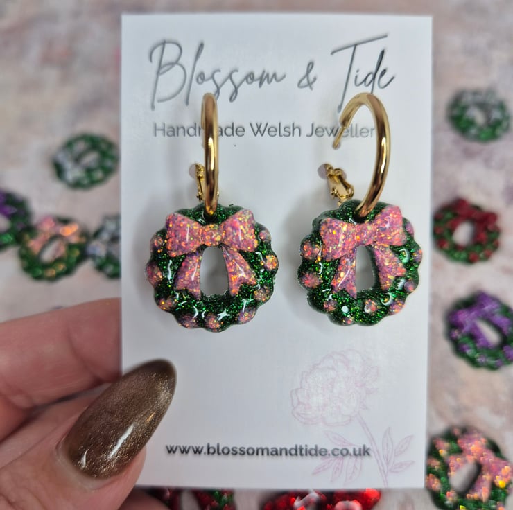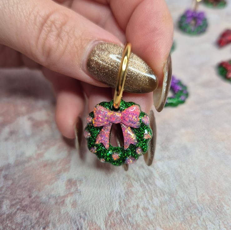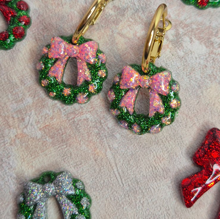 Bring a little festive sparkle to your season with these handmade Christmas glitter wreath earrings. Each wreath features a shimmering green base with a pink bow and baubles — perfect for a girly, playful twist on a classic Christmas look.