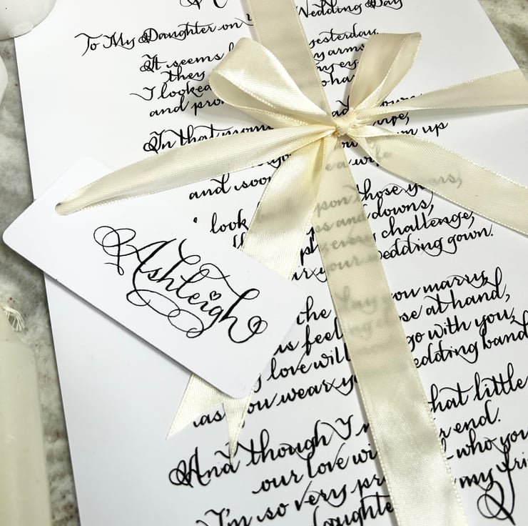 A heartfelt, handwritten letter to your daughter on her wedding day, a keepsake she’ll treasure for a lifetime. Each piece is lovingly written in elegant cursive or calligraphy script, using traditional dip pen ink on premium cardstock, creating a timeless and sentimental finish.