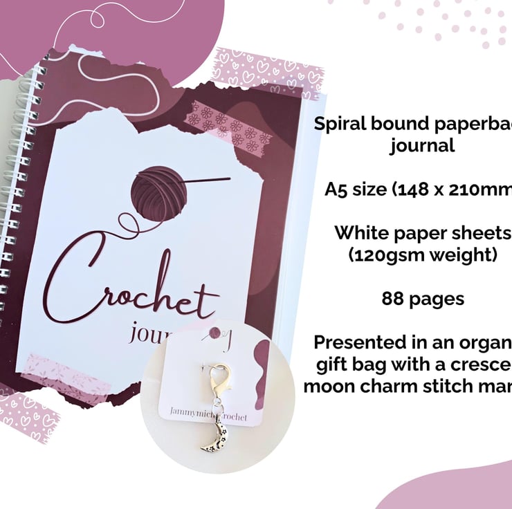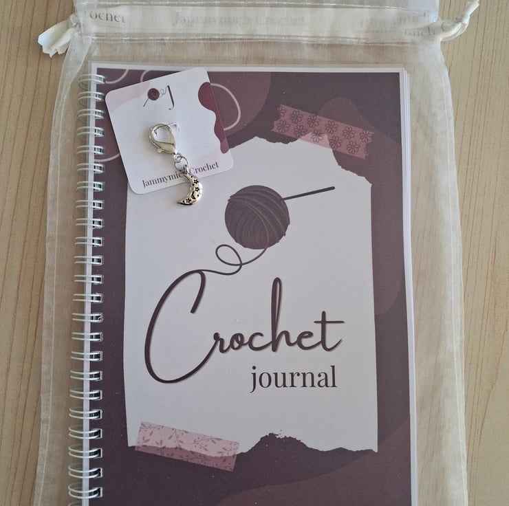 Perfect as a gift for a crocheter in your life. This crochet journal is presented in an organza gift bag with a beautiful crescent moon tibetan charm stitch marker.