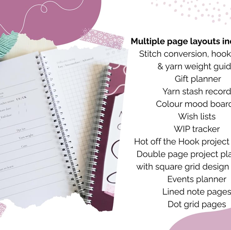 This crochet planner has a white wirebound spine, so can be placed flat for easy use whilst you are busy crocheting. There are 88 pages (44 sheets), in high quality 120gsm weight white paper. Plastic frosted front and back covers protect your planner from damage.