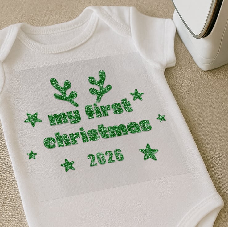 Add a touch of festive cheer to your baby’s first Christmas outfit with this Reindeer Antlers iron-on transfer. Cute, playful, and full of Christmas spirit, it’s perfect for creating a DIY baby grow or sleepsuit that stands out in photos and gift boxes alike.