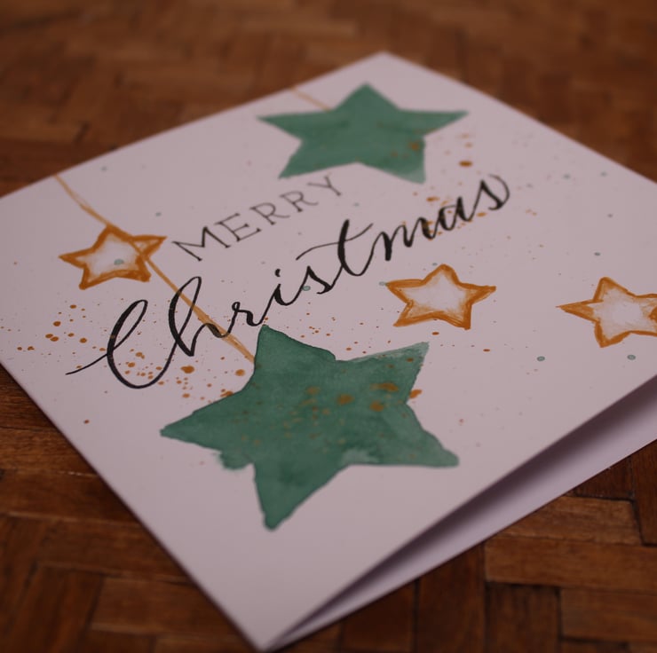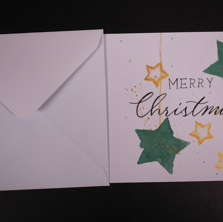Hand painted watercolour and acrylic Christmas card. Made using a soft white card base with green watercolour and golden acrylic stars painted in different sizes on the front. "Merry Christmas" is written in a calligraphy font with black ink on the card. Note that minor size differences or blemishes may occur due to the fact that each card is individually painted and written. Each card comes with a white envelope. Each card and envelope is 5 x 5 inches (or 13 x 13 cm) in size.