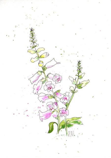 A5 original watercolour of a foxglove presented in a simple white frame. Ink and wash.