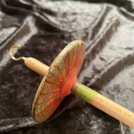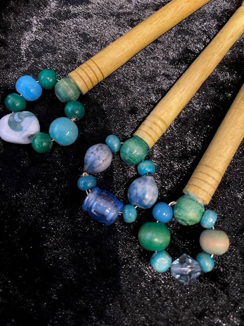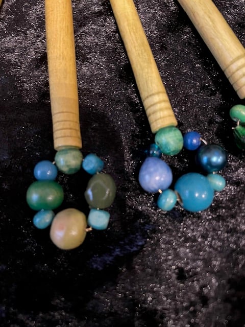 Set of 6 hardwood hand turned midland style lace bobbins with spangles. The bobbins shaft has a green finish and the spangles compliment this colouring.