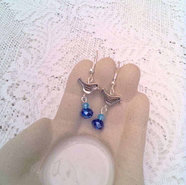 These pretty silver bird and blue crystal earrings would make a lovely gift for someone special for a birthday, anniversary or Christmas or be a lovely treat for yourself. They are light and easy to wear and it would look great for a special occasion or for a casual evening out. They are made using 15 mm x 10 mm silver bird charm, an 8 mm x 6 mm cobalt blue crystal rondelle and a 4 mm sky blue crystal rondelle bead. They have a drop of 1 inch (2.5 cm). The earrings will be dispatched wrapped in tissue paper in an organza bag and delivered via Royal Mail first class post.