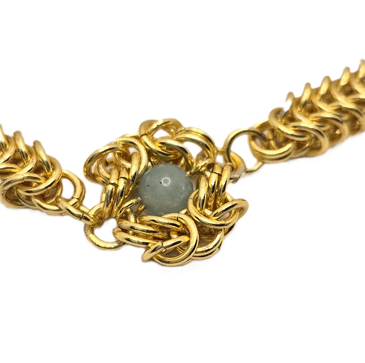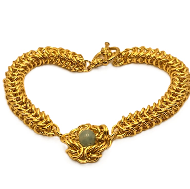 A chainmaille bracelet made with gold plated jump rings in a byzantine pattern with a centre green agate stone