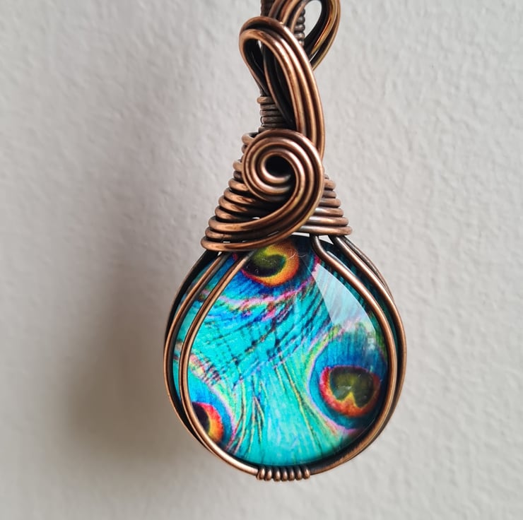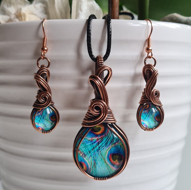 I have handcrafted this stunning and one of a kind pendant using this lovely glass cabochon featuring this gorgeous peacock feather design, which I have wrapped with antiqued copper. I have matching earrings for this pendant available so please check out my other listings and If you would like to buy them together as a set at a discounted rate then please message me
