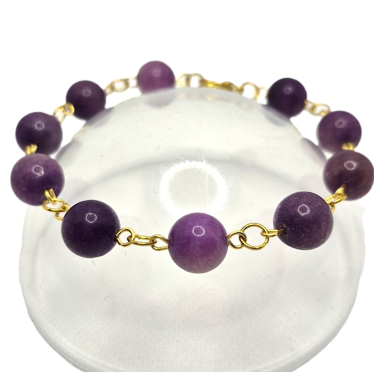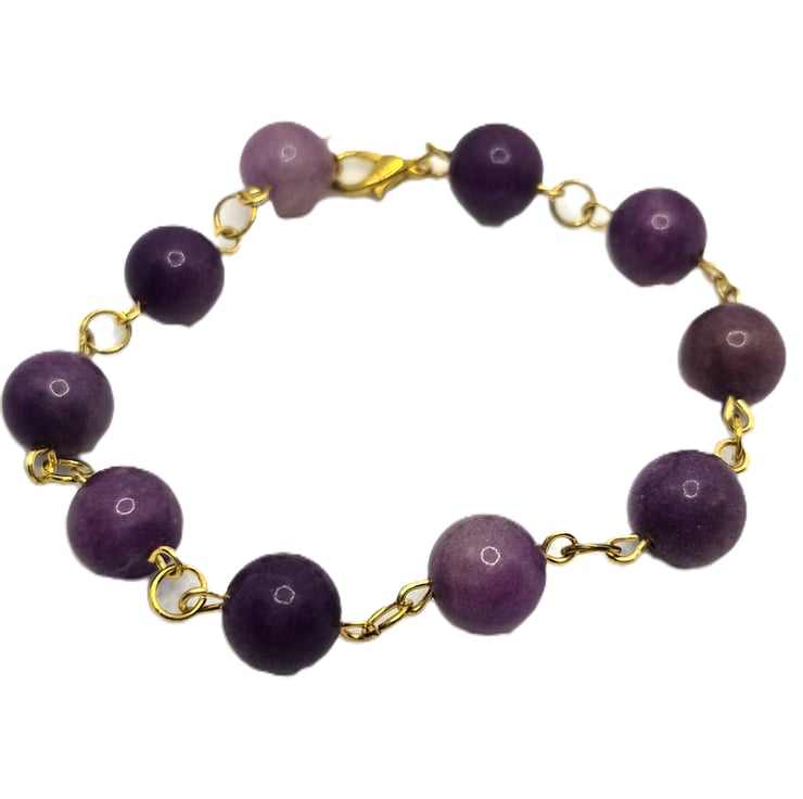 A rosary link bracelet made with purple agate beads and gold plated jump rings