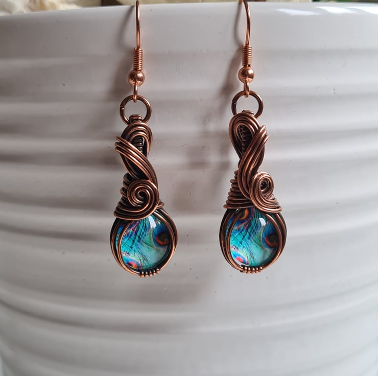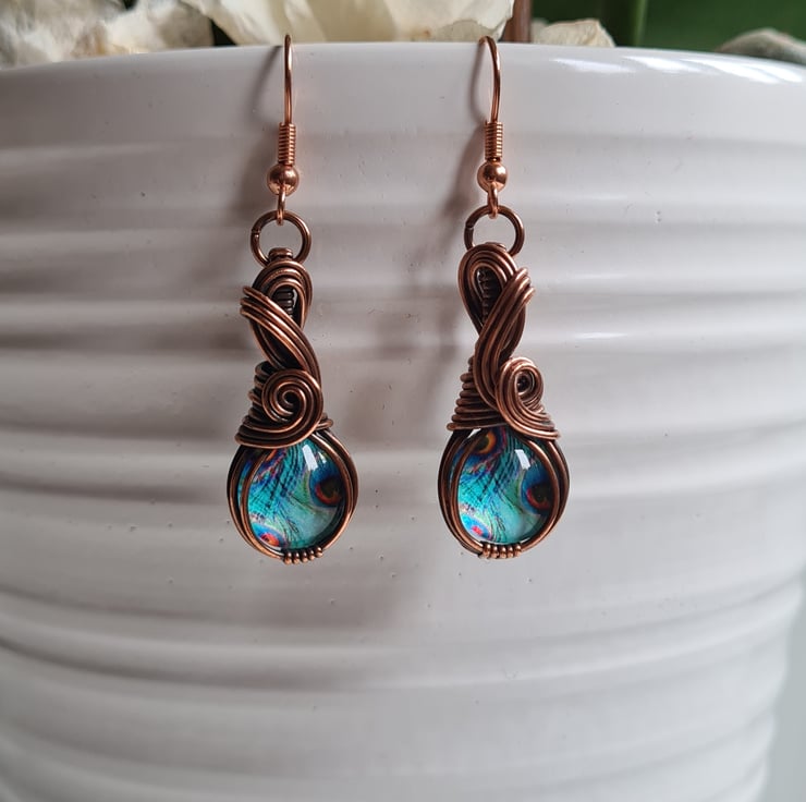 I have handcrafted these stunning and one of a kind earrings using these lovely glass cabochons featuring this gorgeous peacock feather design, which I have wrapped with antiqued copper. I have a matching pendant for these earrings available so please check out my other listings and If you would like to buy them together as a set at a discounted rate then please message me.