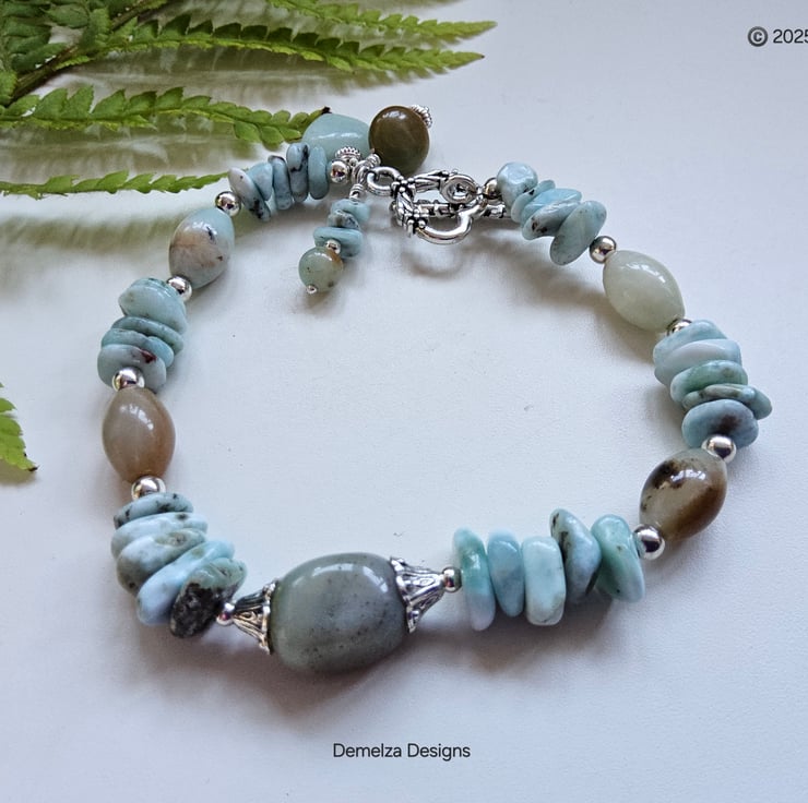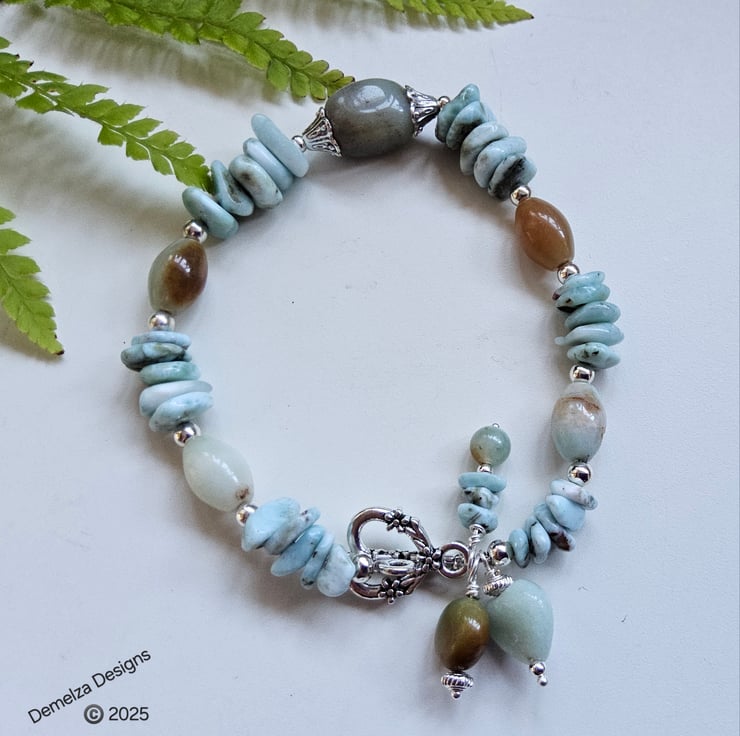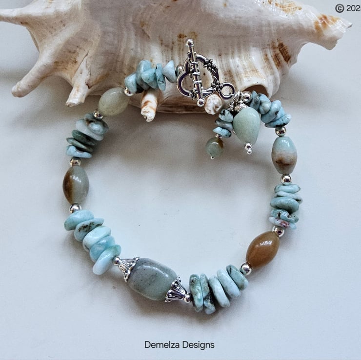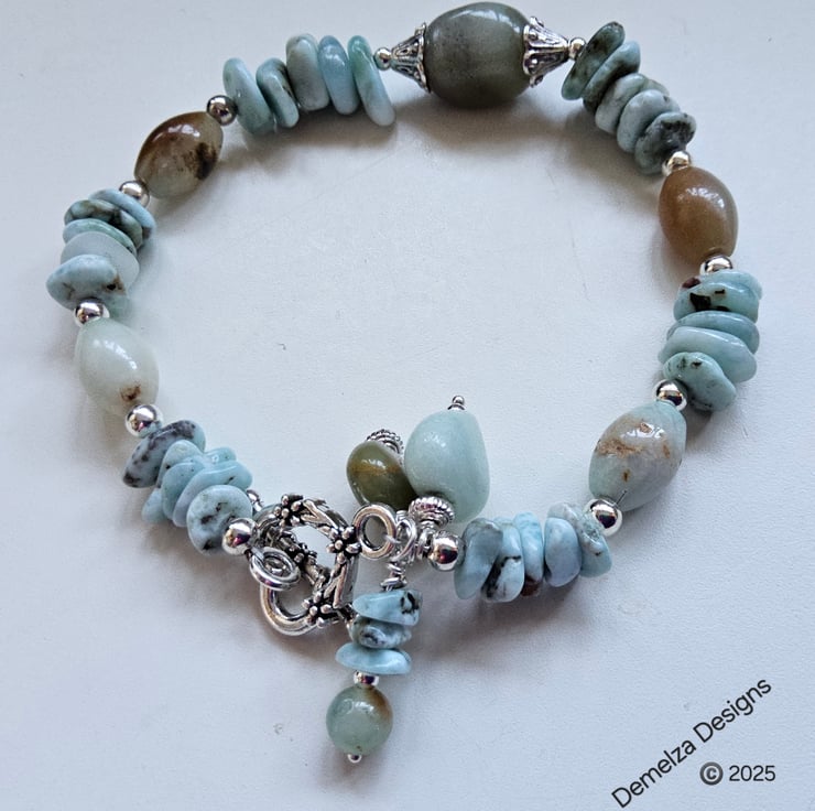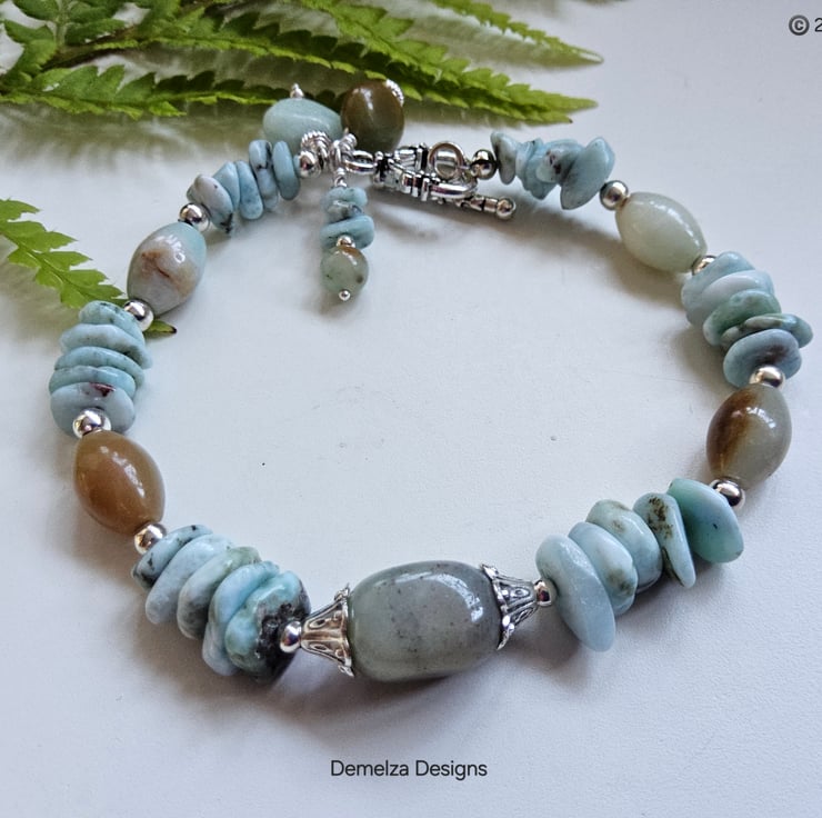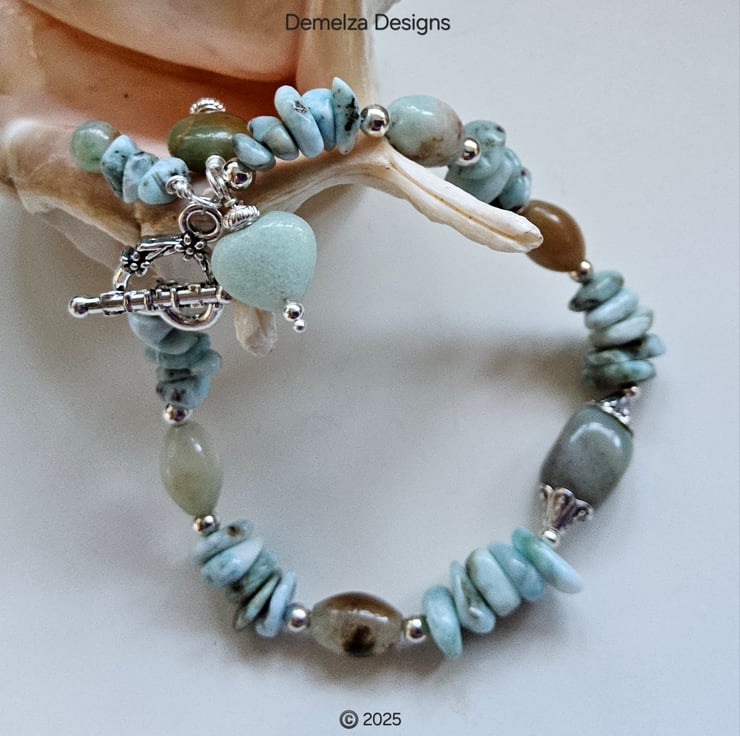 This eye catching bracelet has been thoughtfully designed and hand crafted in Cornwall using quality tumbled genuine natural larimar nuggets, amazonite ovals, coin and heart cut with one single small round.