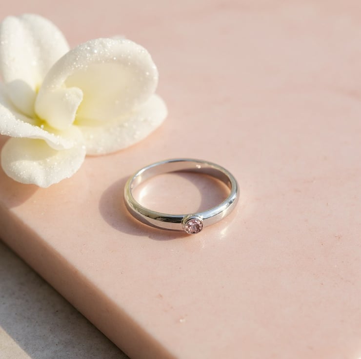 A contemporary sustainable sterling silver ring, featuring a sparkling rose cubic zirconia stone set in a smooth, minimalist design. Each ring is handmade to order in Woolacombe, North Devon by SilverLines Jewellery, combining eco - conscious craftsmanship with timeless coastal style.