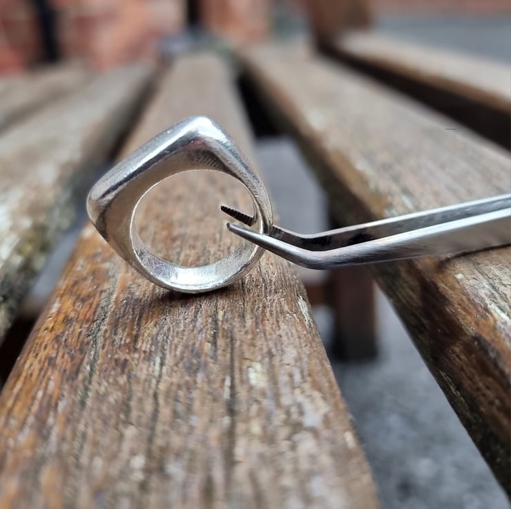 This ring has been uniquely designed by me by using the lost wax casting method. It is a substantial 20g Sterling silver ring made with recycled silver. It is Uk Hallmarked at the Sheffield Assay office . And available for delivery. It is a unisex ring and quite a statement piece The ring is a size R . It will arrive gift boxed .