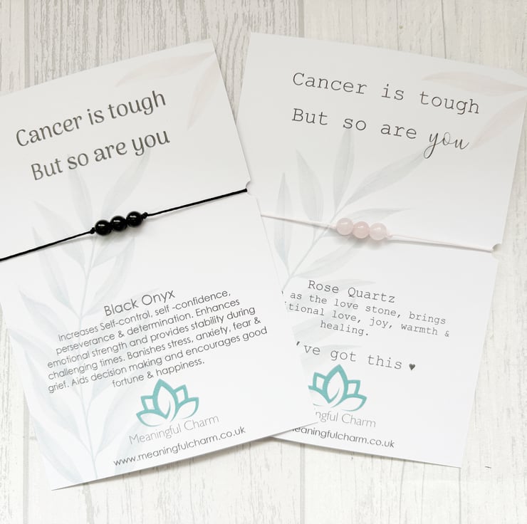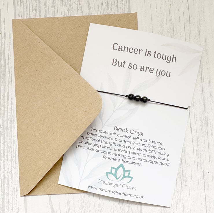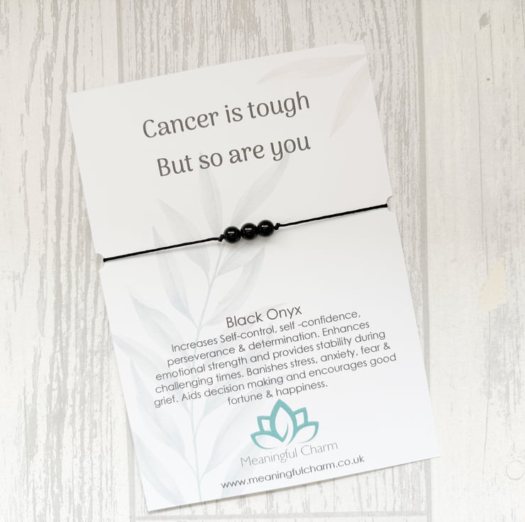 Our Cancer is tough Bracelet Gift is handmade with love, care and intention using genuine natural black onyx gemstones. Soft nylon cord minimalist style bracelet which is fully adjustable to fit all wrists and using no metal parts to make it hypoallergenic, non tarnish and waterproof. They make thoughtful support gifts for cancer survivors, someone recently diagnosed, or starting the chemo journey. A beautiful way to say Get Well Soon or Thinking of You.