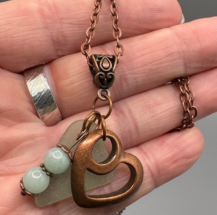 Bohemian style copper heart necklace with sea glass and complimentary glass beads.Copper heart with a lovely smooth piece of seafoam Scottish sea glass.