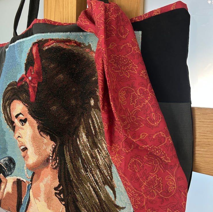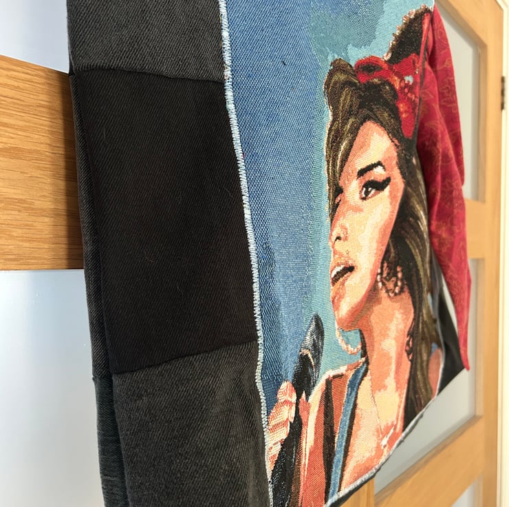 Patchwork denim tote bag featuring a woven canvas print of the legendary Amy Winehouse.