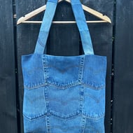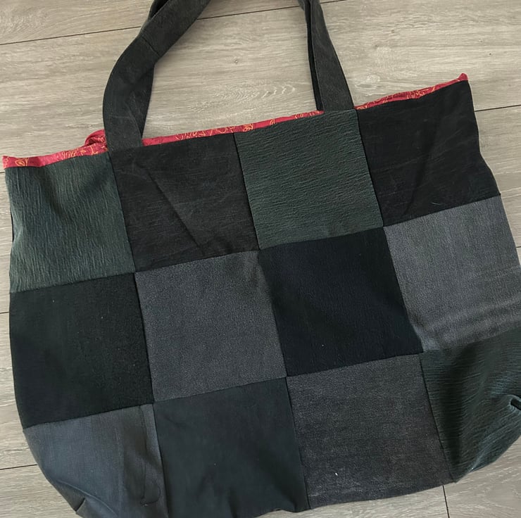 The patchwork denim squares have been upcycled from black and grey denim jeans.