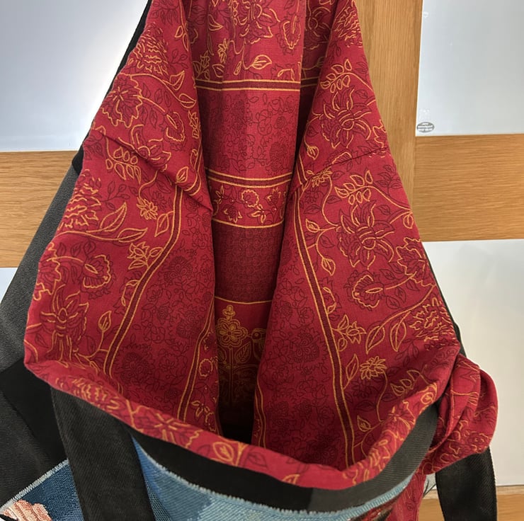 The bag is extra large and has a red cotton lining and matching scarf tied around one of the bag handles.