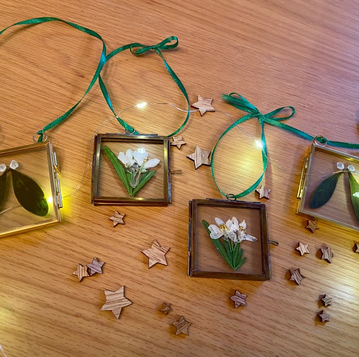 Beautiful hanging decoration made with pressed Mexican orange blossom flowers in a lovely vintage glass hanging decoration complete with ribbon.