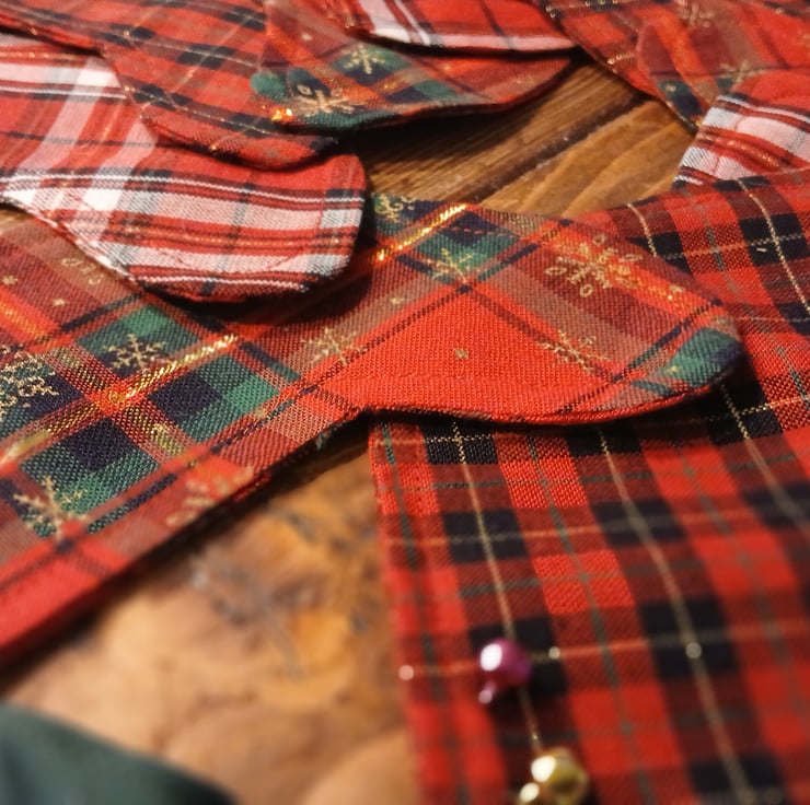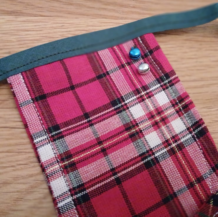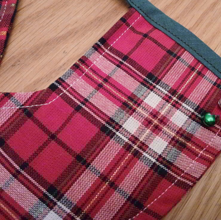 Each stocking made with Christmas tartan fabric has been finished with top stitching and joyful Christmas bells.