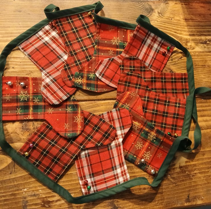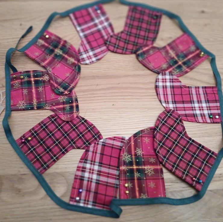 The bunting measures approximately 170cm in length with each stocking measuring approximately 11cm at the widest part and 13cm in length. There are 10 tartan stockings in total with a dark green binding, with loops either end for ease of hanging.