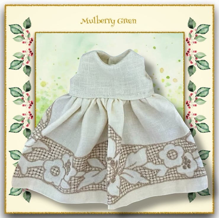 A lovely little embroidered linen dress, to fit the Mulberry Green characters. The dress has a lined bodice and is part of the heirloom collection.