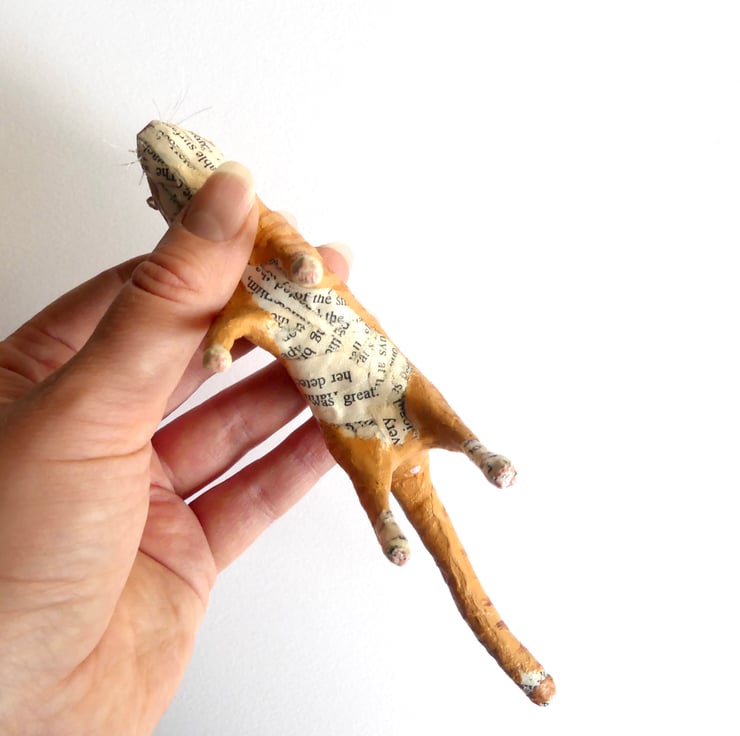 My little animal models are inspired by the stories I tell myself when I walk in the forest near my home and my childhood toys. I created these unusual, quirky sculptures because I wanted to decorate my bedroom with little woodland creatures, crooked wooden houses and miniature Canadian log cabins. I build these from recycled vintage book pages - I do not use any wire structure underneath, each sculpture is built entirely from the paper. I paint each animal carefully by hand. Each sculpture is unique in shape, appearance and character.