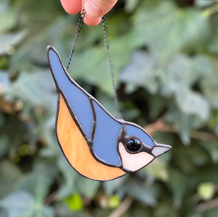 Hung from a fine black chain, the stained glass nuthatch decoration measures approximately 11cm from beak tip to tail and is 7cm at its widest point.
