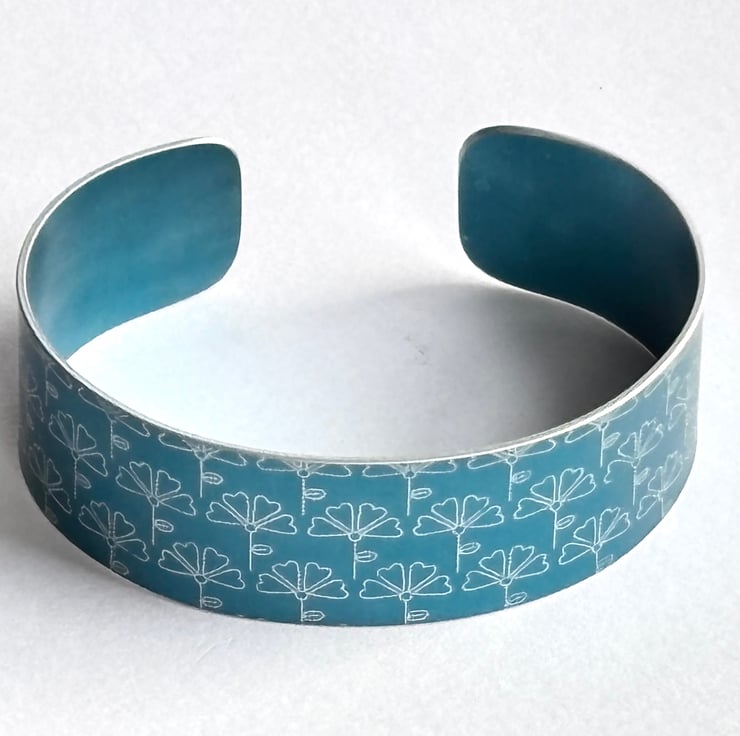 A stylish bracelet/narrow cuff made from anodised aluminium with a mini print of flowers. I drew this pattern digitally, made it into a resist and applied it to the metal. I then dye the aluminium, seal it and remove the resist which leaves the pattern showing in the original colour of the metal. The cuff is then made using traditional metalworking techniques.