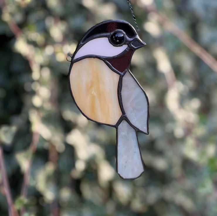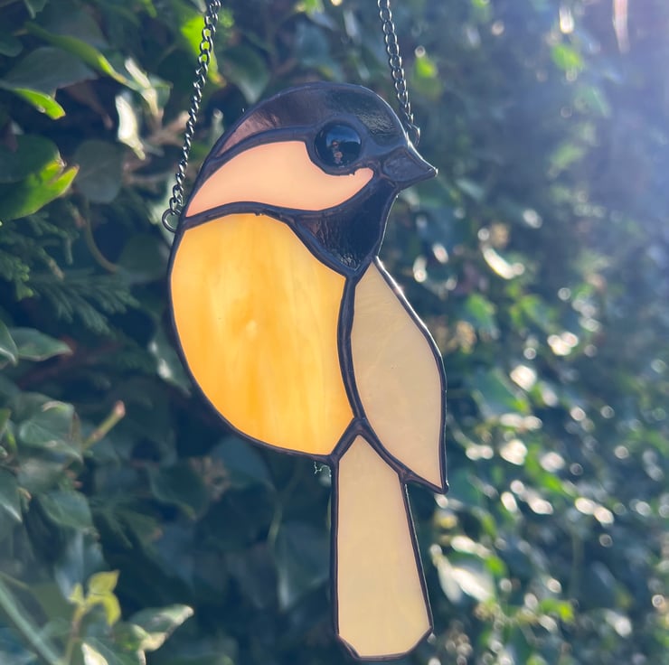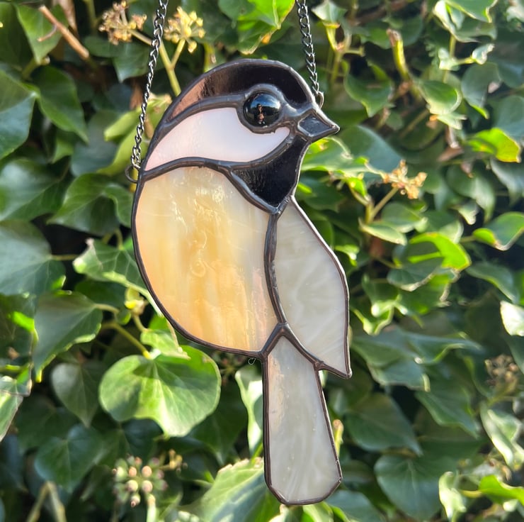 Hung from a fine black chain, the stained glass coal tit measures approximately 13.5cm tall by 6.5cm wide.