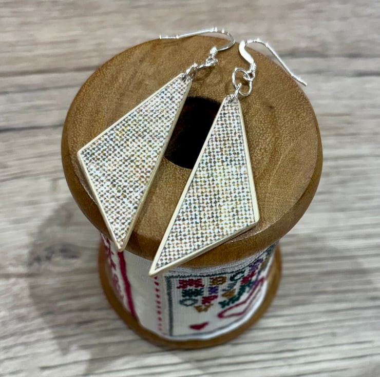 These earrings feature digital copies of original vintage Cross Stitch patterns from my collection. An image of a counted thread linen fabric has been added to the back. Silver plated jump rings and sterling silver ear hooks complete the earrings. Presented wrapped in recycled tissue paper in a purpose-made recycled card pillow box. More designs coming soon.
