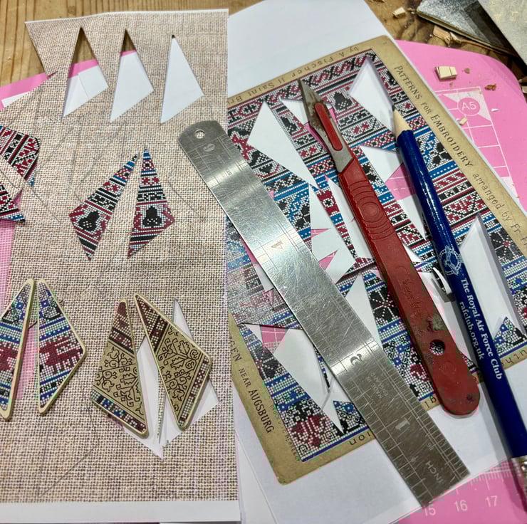 I love fragments of pattern. I had some leftover slats from a too long Venetian blind and wanted to find a use for them. The resulting earrings are incredibly lightweight and comfortable to wear.