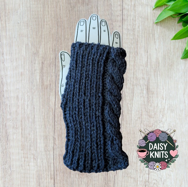 Dark Blue Hand-Knitted Fingerless Gloves with Cable Pattern