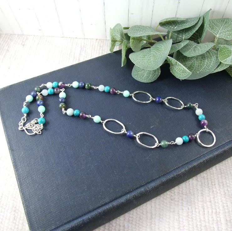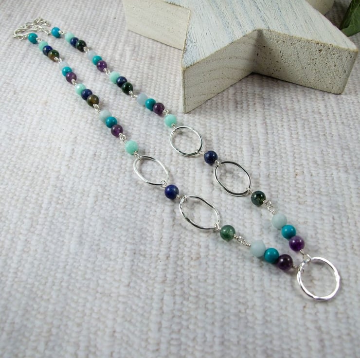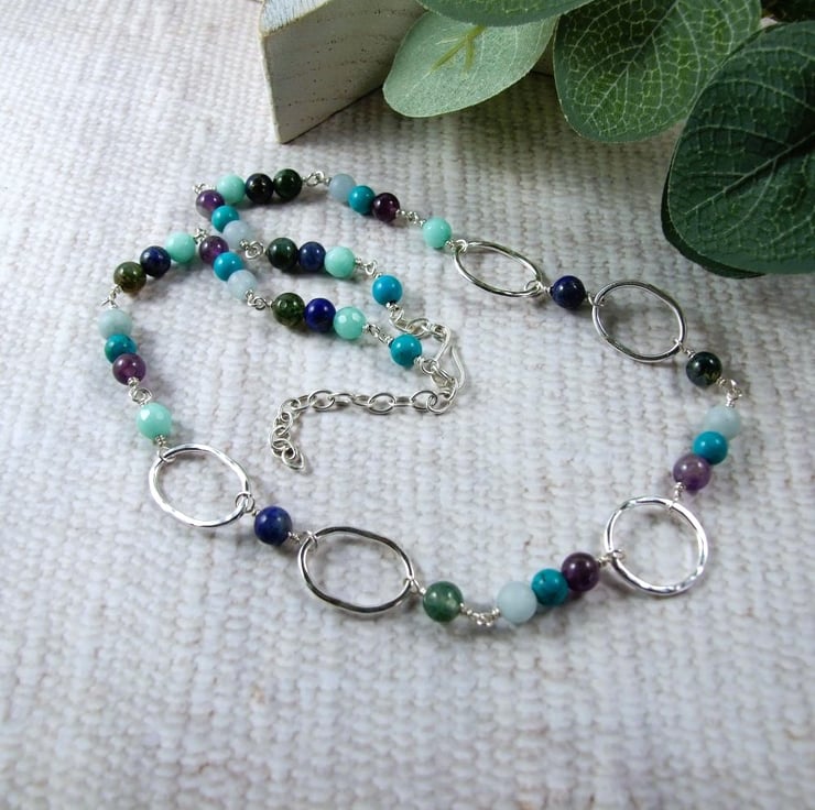 Sterling Silver and Gemstone Necklace. Handcrafted with sterling silver and gemstones including turquoise, aquamarine, moss agate, green agate, lapis lazuli and amethyst.