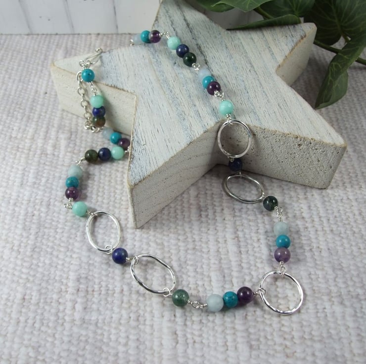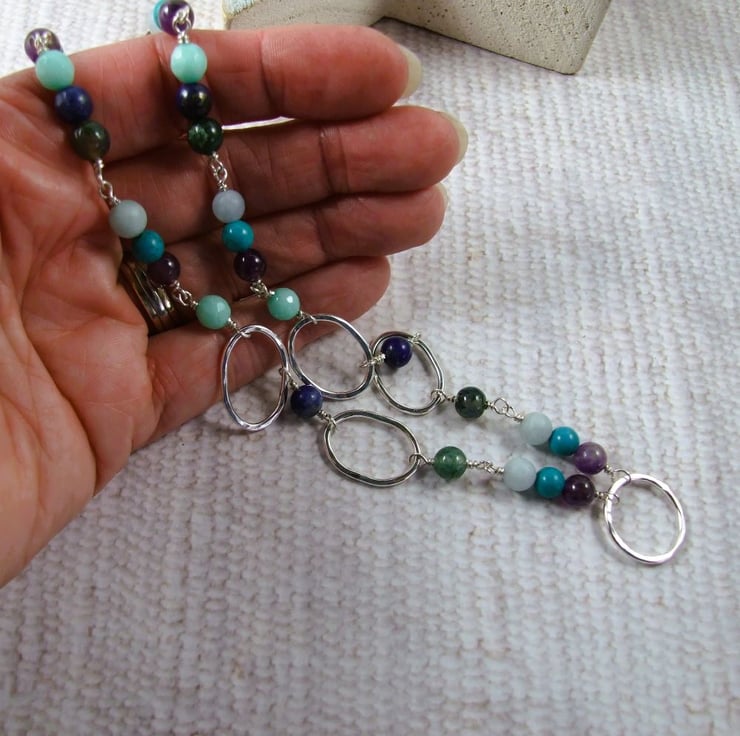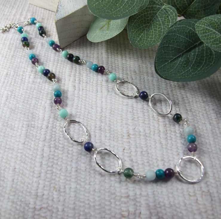 I created the silver circle and oval shapes from 1.5mm recycled silver wire, shaped by hand, soldered and textured. I have used thin silver wire to securely wire wrap the 6mm round mixed gemstones together with the silver components to create an 18 inch necklace. I have added a 2 inch length of silver chain so that the necklace can be worn up to 20 inches.