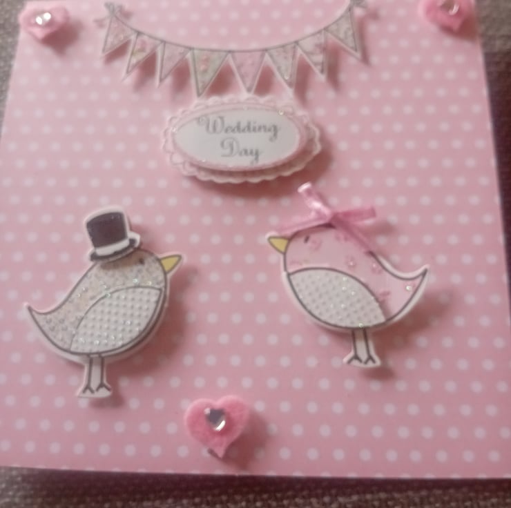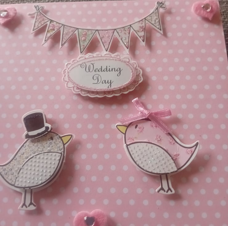 pink spotted card with matching envelope features these cute little love birds. The male bird has on his top hat, and the lady bird has a pretty pink bow on her head. Underneath is a felt heart shape with a gem, and at the top a pretty banner. has a greeting for the wedding day.